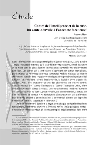 L'article de Josiane Bru explore la distinction entre les contes-nouvelles et les contes facétieux, en examinant leur classification et les motifs récurrents. L'auteur souligne la complexité de ces récits, souvent marqués par l'intelligence rusée des personnages et le traitement des conflits entre sexes et classes sociales. Il invite également à une meilleure documentation et compréhension des versions contemporaines de ces contes en France.