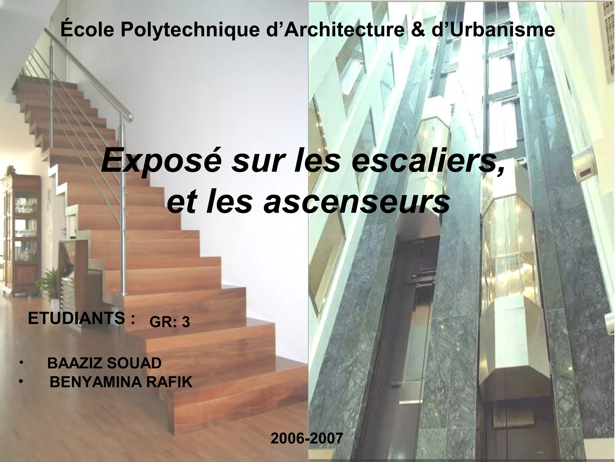 Le document présente une étude sur les escaliers et les ascenseurs, soulignant leur rôle dans la circulation verticale dans les bâtiments. Il décrit les différentes types d'escaliers, leur composition, ainsi que les normes de sécurité et les spécificités techniques relatives aux ascenseurs. Les escaliers mécaniques et leurs avantages par rapport aux ascenseurs sont également abordés, avec des consignes de sécurité et des recommandations pour l'installation.