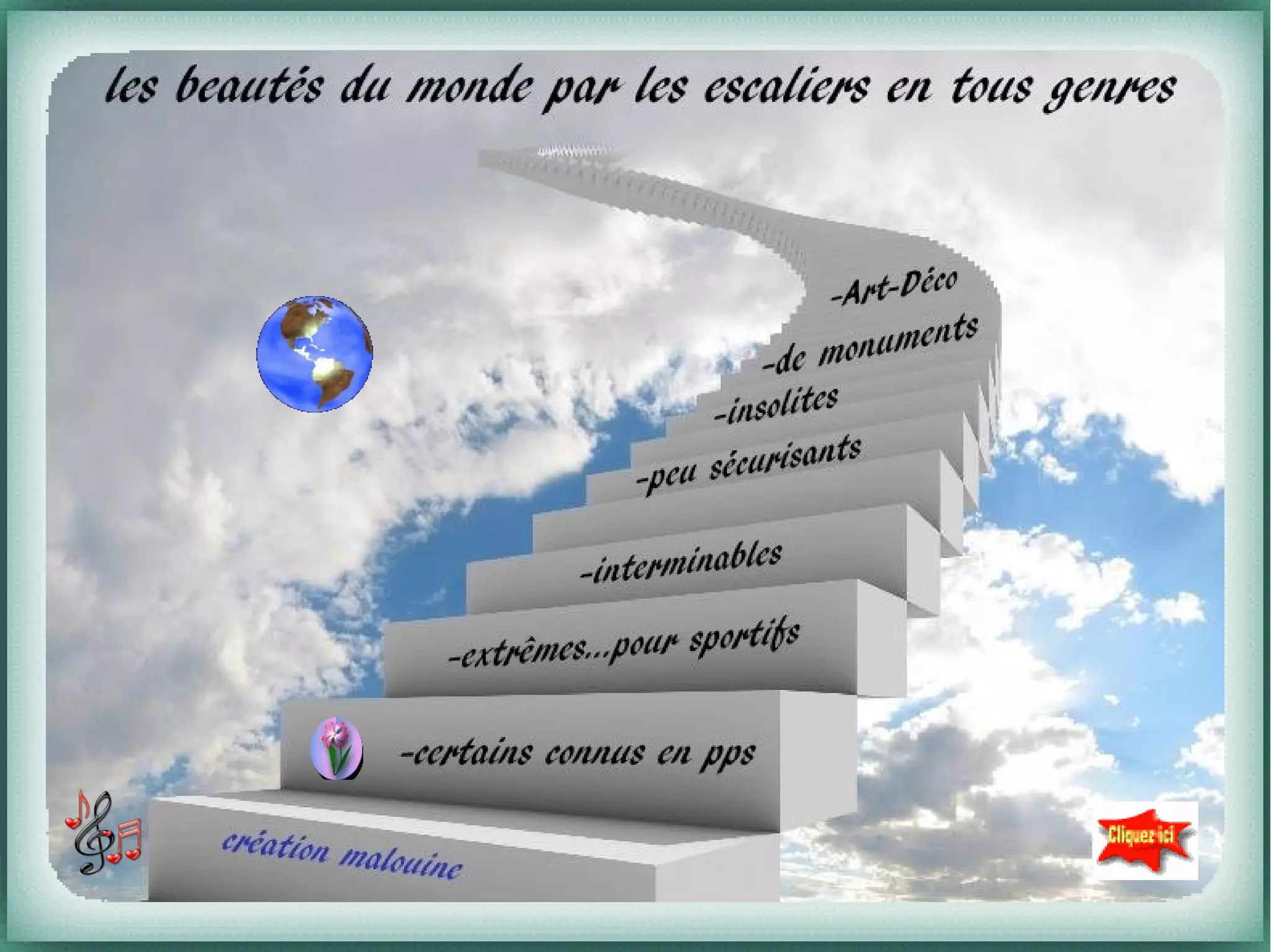 Le document présente une liste d'escaliers célèbres dans le monde, chacun avec des caractéristiques uniques, comme le nombre de marches et leur histoire. Parmi eux, on trouve l'escalier de Moraga à San Francisco et le Selaron à Rio de Janeiro, ainsi que d'autres en Europe, en Asie et en Amérique. Chaque escalier offre une vue ou une expérience particulière, attirant les visiteurs pour leur beauté et leur défi physique.