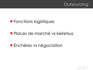 Le document traite des différents mécanismes d'externalisation des fonctions logistiques, y compris les places de marché et les keiretsus, ainsi que des processus décisionnels liés aux enchères et à la négociation. Il examine les types d'enchères et les critères de décision influençant le sourcing, en s'appuyant sur plusieurs études et articles de recherche. Enfin, il propose des lignes directrices pour une approche structurée de l'externalisation.
