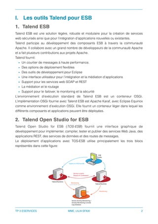 Ce document présente un TP sur la mise en place d'un ESB avec Talend ESB, abordant la création de services web, la configuration des routes, et le déploiement de services. Il décrit également l'utilisation de Talend Open Studio pour la création, l'exécution et le déploiement de services SOAP, ainsi que la création et la modification de routes pour le filtrage et la transformation de messages. Enfin, le TP invite les élèves à réaliser un exercice pratique en créant un service web utilisant plusieurs routes.
