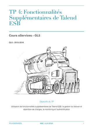 Ce document présente un TP sur l'utilisation des fonctionnalités avancées de Talend ESB, notamment le failover, la répartition de charge, le monitoring et l'authentification à l'aide de composants tels que le Service Locator et le Service Activity Monitoring. Les étapes de configuration et de test de ces fonctionnalités sont détaillées, y compris le déploiement dans les conteneurs, l'activation des services et les tests de leur efficacité. Le document aborde également l'implémentation d'un Service Token Security pour assurer l'authentification sécurisée des clients.