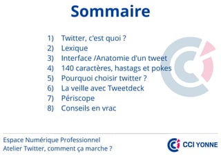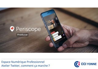 Twitter est un réseau social permettant d'envoyer des messages publics de 140 caractères maximum, facilitant la communication en temps réel, le partage d'opinions et le dialogue. Il offre des fonctionnalités telles que le hashtag pour catégoriser les publications et des outils de veille stratégique comme Tweetdeck. L'application Periscope permet également des diffusions vidéo en direct, intégrées à Twitter.