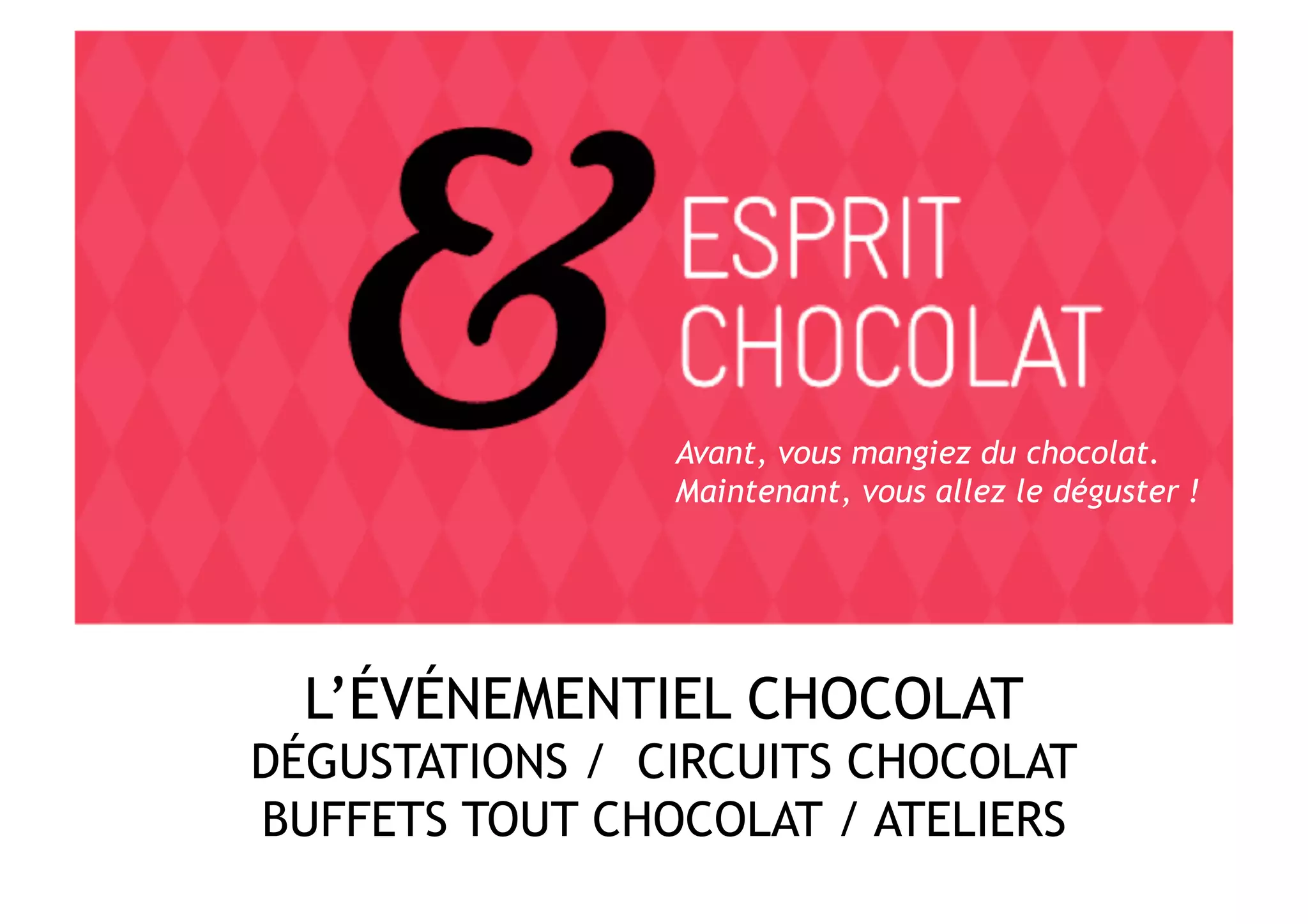 Esprit Chocolat propose des dégustations, ateliers et événements autour du chocolat, permettant aux participants d'explorer les différentes origines et saveurs des chocolats. Les offres incluent des dégustations thématiques, des accords avec des boissons, des ateliers pratiques et des animations de teambuilding. Des événements pour particuliers et entreprises sont également disponibles, avec un accent sur l'expérience sensorielle et la découverte du chocolat.