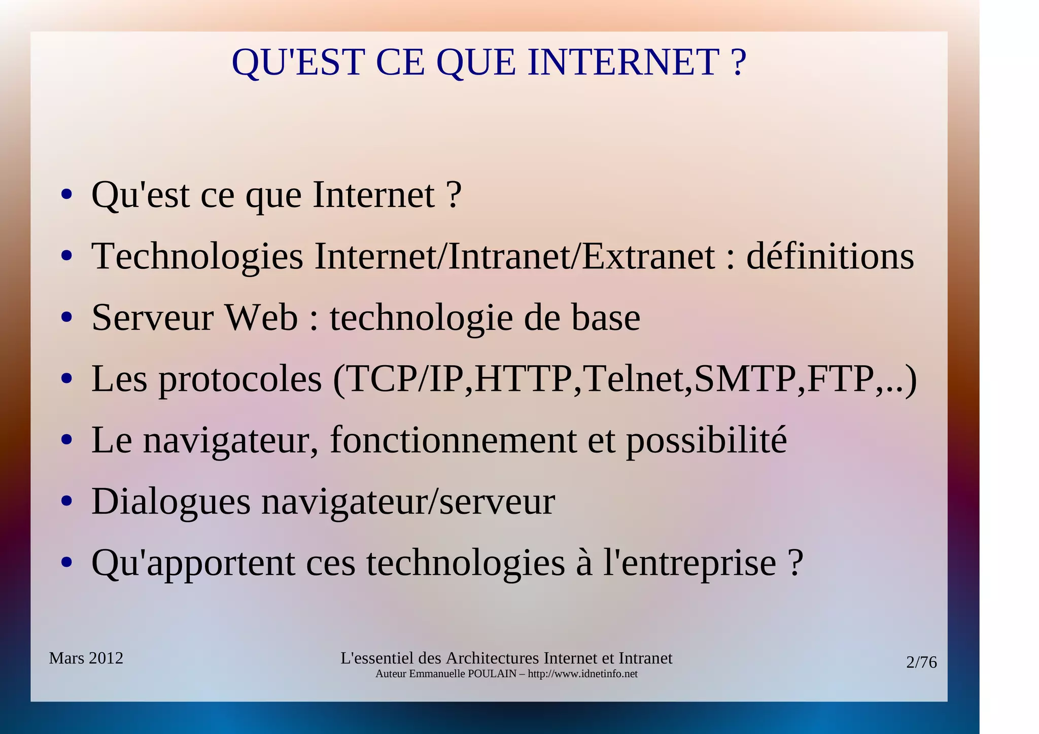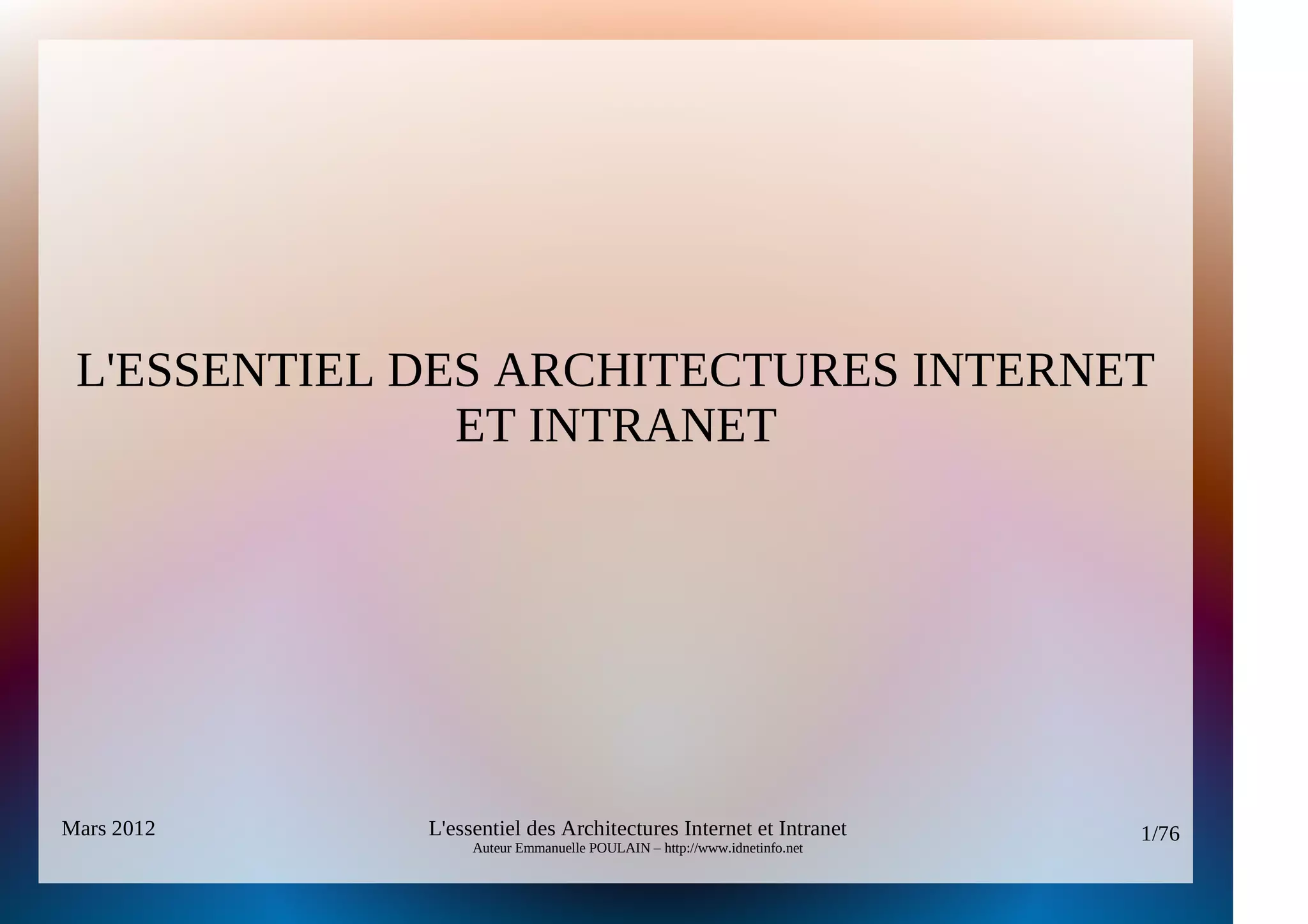 Le document présente un aperçu des architectures Internet et intranet, abordant des sujets tels que les technologies, les protocoles, et l'évolution des applications web. Il décrit la transition vers le web 2.0 et l'impact de l'open source sur les serveurs et les technologies utilisées dans les entreprises. Les développements récents, comme HTML5 et CSS3, transforment la manière dont les applications sont conçues et interagissent sur divers supports.