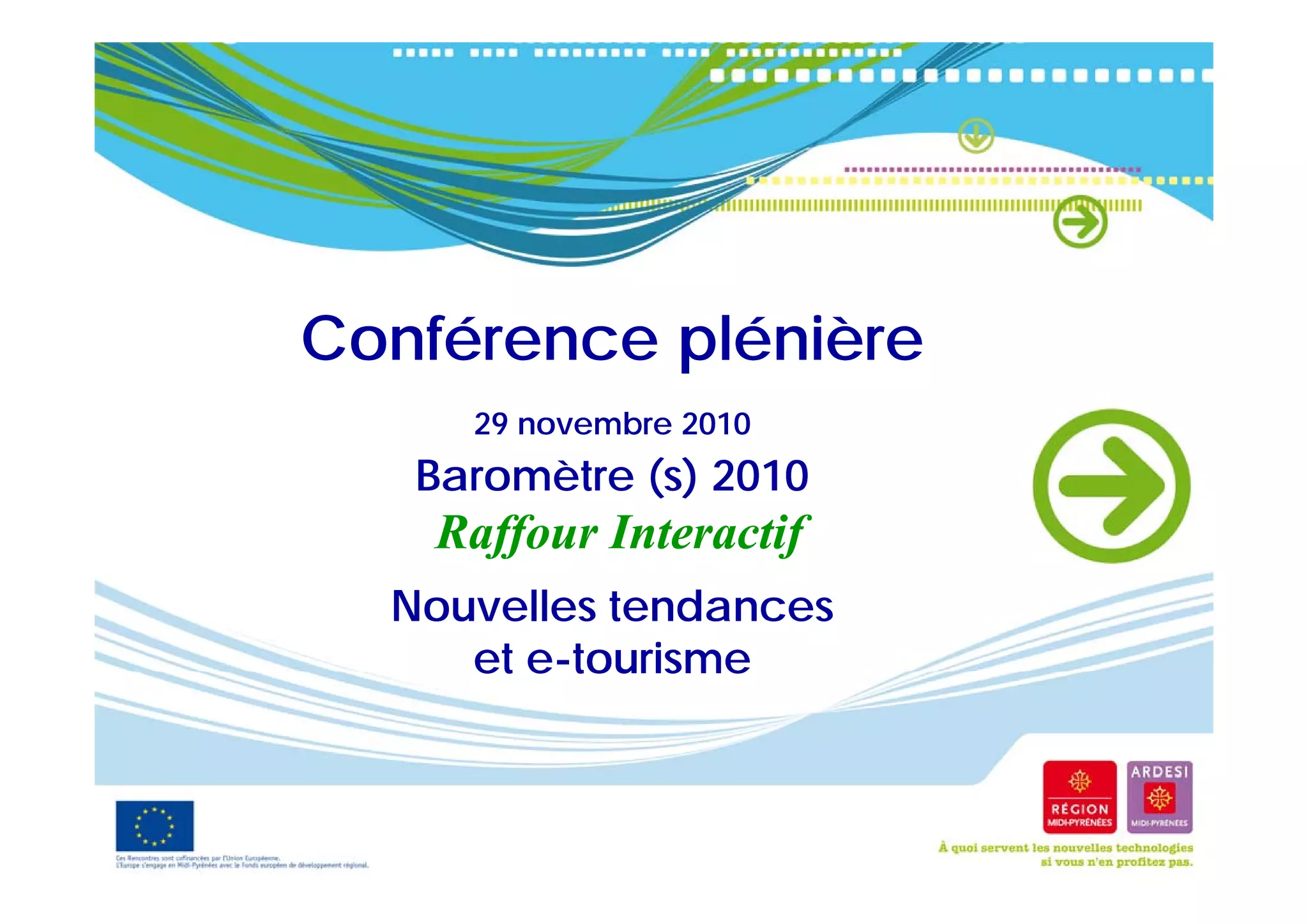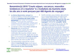 Le document présente les résultats du 8ème baromètre du tourisme et de l'e-tourisme, basé sur une enquête menée auprès de 400 agents de voyages. Il souligne les besoins des Français en matière de vacances, la préparation et la réservation de séjours en ligne, ainsi que les évolutions prévues dans le secteur touristique d'ici dix ans. En outre, il évoque l'importance croissante des avis en ligne et l'expertise des clients en raison de l'accès à des informations en temps réel.