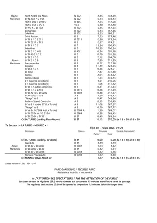 Le document décrit le parcours détaillé du 16e rallye Monte-Carlo historique, se déroulant du 25 janvier au 1er février 2013, avec une étape spécifique entre Gap et Monaco, totalisant 270,09 km. Il fournit des informations sur les communes traversées, les distances, les horaires approximatifs, ainsi que les zones de test de régularité. Des indications sur l'assistance et les zones de stationnement pour les spectateurs sont également incluses.