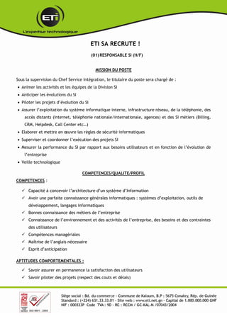 La société ETI recrute pour plusieurs postes liés aux systèmes d'information, y compris un responsable SI, un support SI et des ingénieurs en études et développement. Les candidats doivent posséder des compétences techniques en informatique, une expérience pertinente, et répondre aux besoins des utilisateurs tout en assurant la sécurité des systèmes. Les qualifications requises incluent des diplômes en informatique et une expérience variable selon le poste, avec une date limite de candidature fixée au 11 octobre 2016.