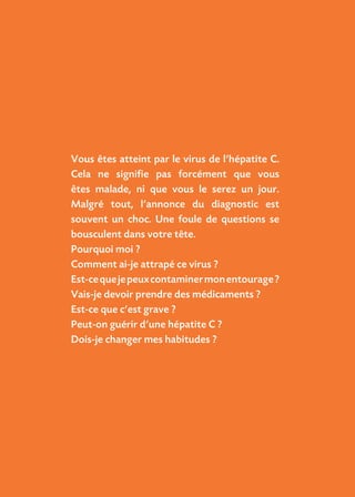 Le document traite de la vie avec l'hépatite C, fournissant des informations essentielles sur la gestion de la maladie, l'importance de la communication avec les médecins et l'entourage, ainsi que des conseils pratiques sur la transmission, les habitudes de vie et le soutien psychologique. Il souligne que bien qu'un diagnostic d'hépatite C puisse être bouleversant, il est vital de se renseigner et de construire une relation de confiance avec son professionnel de santé. Des recommandations sont également données sur les précautions à prendre pour protéger son entourage et maintenir une qualité de vie.