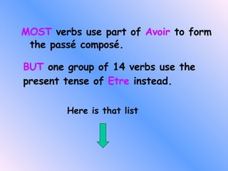 Le document explique comment former le passé composé avec l'auxiliaire 'être', en précisant que certains verbes, connus sous le nom de 'mrs van der tramp', utilisent 'être' au lieu de 'avoir'. Il souligne également l'importance de l'accord du participe passé en fonction du genre et du nombre du sujet. Une liste de verbes et des exemples d'accords sont fournis pour illustrer les règles.
