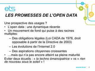 Le document discute des promesses et défis de l'open data, un mouvement mondial en constante expansion depuis 2009 qui vise à améliorer la transparence et la participation citoyenne. Il souligne la nécessité d'une meilleure articulation de l'action de l'État et des collectivités territoriales pour atteindre une maturité dans l'utilisation des données ouvertes. Enfin, il présente l'open data comme un levier pour la modernisation de l'action publique et la co-production de données avec les citoyens.