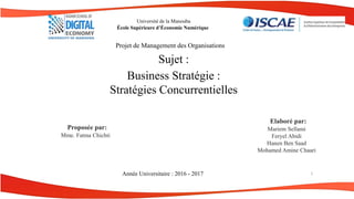 Le document présente une analyse des stratégies concurrentielles en management, en s'appuyant sur les travaux de Michael Porter et en illustrant les concepts à travers une étude de cas sur Coca-Cola. Il aborde des stratégies telles que la domination par les coûts, la différenciation et les stratégies de niche, tout en discutant des implications organisationnelles et des risques associés. L'exemple de Coca-Cola démontre comment une entreprise peut maintenir un avantage concurrentiel grâce à une image de marque forte et une diversification stratégique.