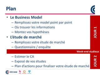 Le document décrit les étapes nécessaires à la création d'un business model, incluant l'élaboration d'une étude de marché et d'un plan d'affaires. Il fournit des conseils pratiques pour évaluer le marché, comprendre les besoins des clients et structurer une offre. Des outils comme le Business Model Canvas et divers articles et ressources pour la recherche sont également mentionnés.
