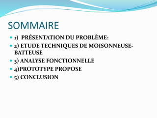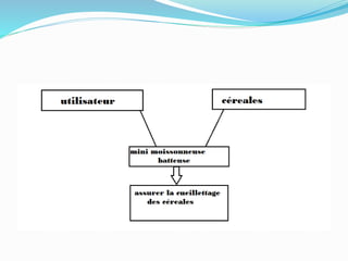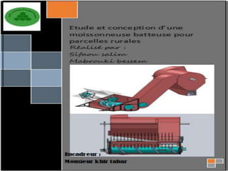 Ce document présente une étude sur la conception d'une moissonneuse-batteuse destinée aux petits agriculteurs du sud tunisien, afin de faciliter la récolte biologique de céréales comme le blé et l'orge. Il aborde les aspects techniques des engins agricoles existants, l'analyse fonctionnelle, et propose un prototype simple et abordable. La conclusion souligne l'importance de cette étude pour comprendre la technologie et répondre aux besoins des agriculteurs.
