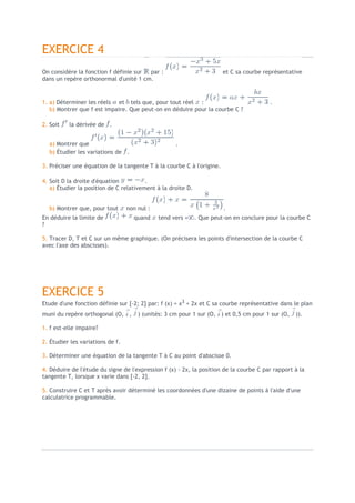 Ce document présente plusieurs exercices d'analyse de fonctions mathématiques, incluant l'étude des variations, la détermination des tangentes et des points d'intersection entre différentes courbes. Chaque exercice aborde des concepts comme les dérivées, les propriétés des fonctions (parité, asymptotes) et des représentations graphiques. La méthode inclut des étapes de calcul et des vérifications graphiques à l'aide de calculatrices.