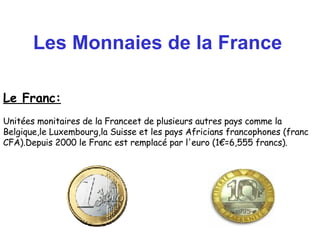 Le document traite des monnaies en France, notamment du passage du franc à l'euro en 2000. Il présente également le système politique français, un régime semi-présidentiel avec l'Assemblée nationale et le Sénat, ainsi que la fête nationale célébrée chaque 14 juillet. Enfin, il donne un aperçu de l'économie française, où les services dominent, suivis des industries et de l'agriculture.