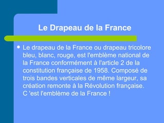 Le drapeau tricolore de la France, composé de trois bandes verticales bleu, blanc et rouge, est l'emblème national depuis 1958, symbolisant la Révolution française. Avant cela, la fleur de lys était l'emblème des rois de France, utilisée jusqu'à sa perte officielle en 1830. Le blason de France a également été associé aux armoiries des rois d'Angleterre et se retrouve actuellement dans les armoiries canadiennes.