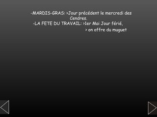 Le document décrit diverses fêtes et traditions françaises, tant populaires que religieuses. Parmi celles-ci figurent la Chandeleur, le Mardi Gras, la fête de la musique, Noël et Pâques, chacune accompagnée de ses coutumes spécifiques. Ces célébrations reflètent la culture et l'histoire française à travers des événements marquants et des traditions culinaires.
