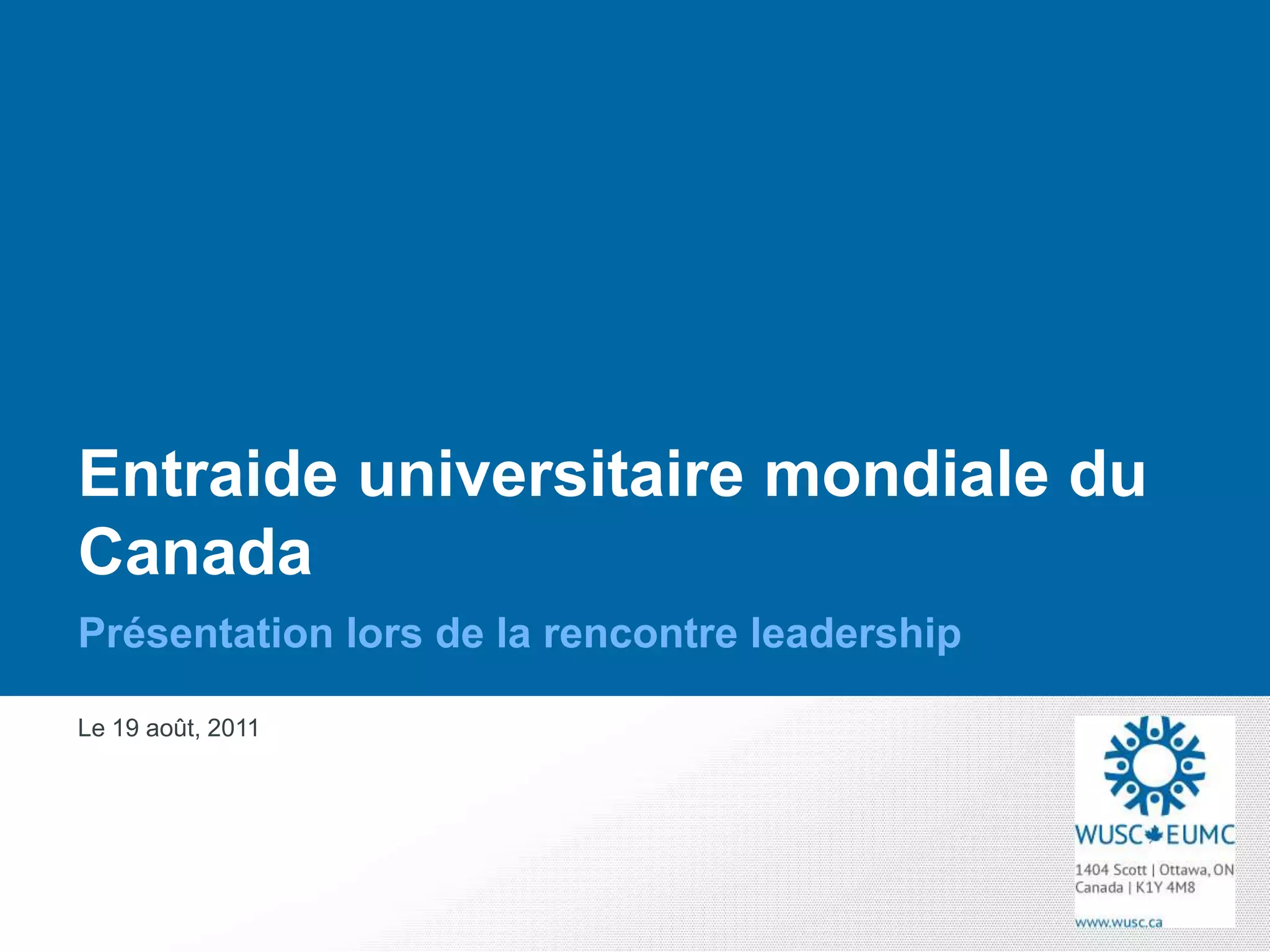 L'Entraide universitaire mondiale du Canada (EUMC) est une ONG qui promeut le développement humain et la compréhension globale par l'éducation dans 13 pays. Elle offre des opportunités aux étudiants canadiens pour s'impliquer dans des projets de développement, tout en soutenant l'éducation des réfugiés et des filles. L'EUMC recherche également de nouveaux membres pour son conseil d'administration et invite à participer à son forum international pour renforcer les initiatives éducatives et communautaires.