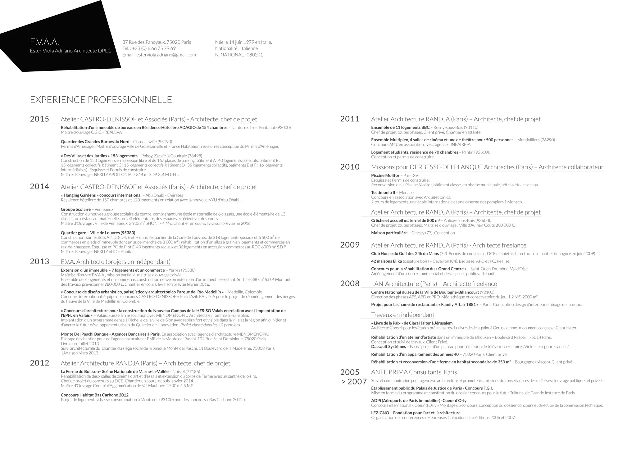 Ester Viola Adriano, née en 1979 en Italie, est une architecte diplômée de l'école d'architecture de Paris, active à Paris depuis 2005. Elle a dirigé de nombreux projets d'architecture, incluant des réhabilitations, des constructions de logements sociaux et des concours internationaux. En plus de ses compétences en architecture, elle est également artiste et travaille en collaboration avec des designers sur des conceptions scéniques.