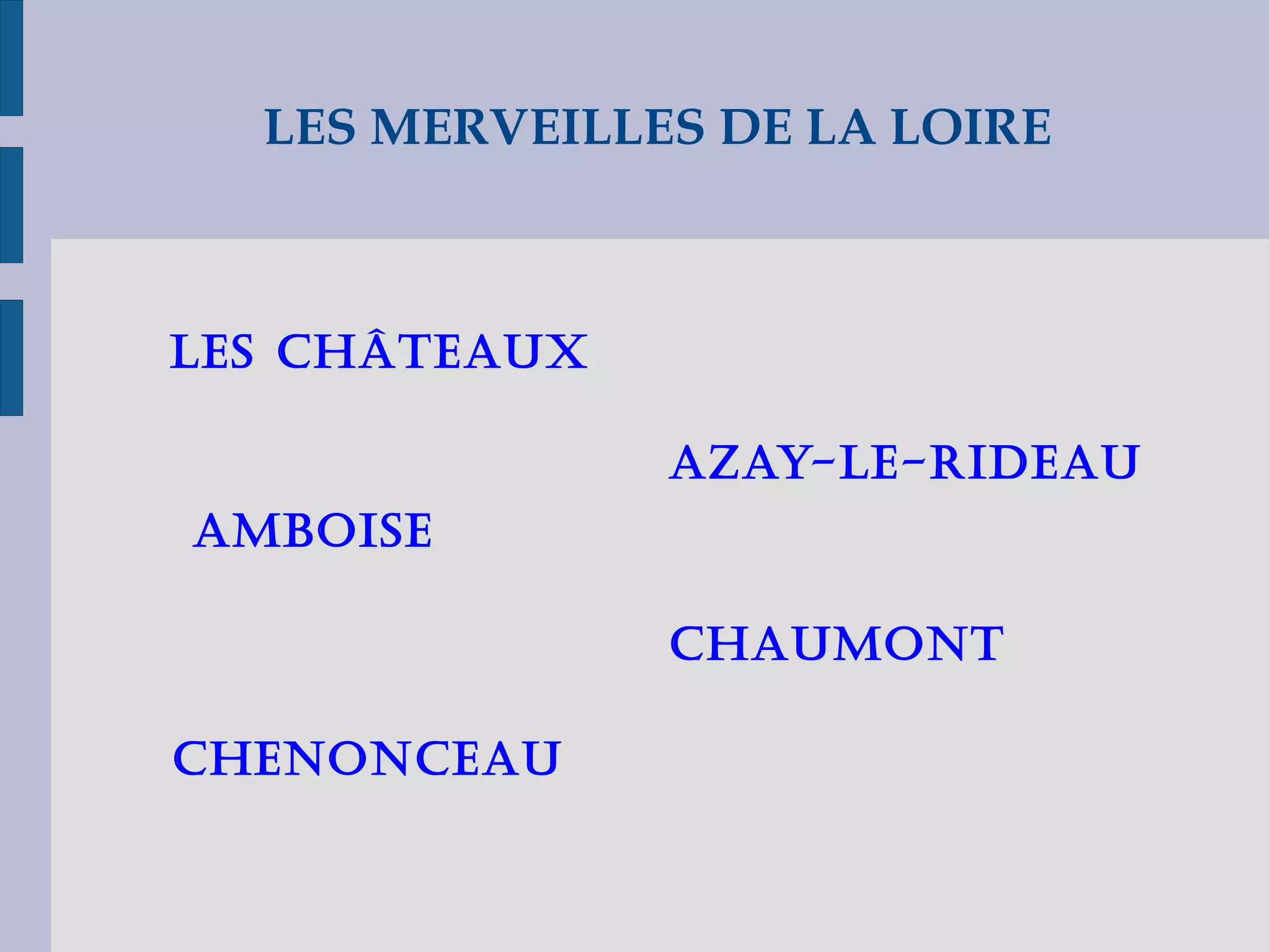 Le document présente les châteaux de la Loire, témoignant de l'architecture française et de l'histoire monarchique. Parmi eux, le château d'Azay-le-Rideau, joyau de la Renaissance, le château d'Amboise, ancienne demeure de souverains, et le château de Chenonceau, célèbre pour son lien avec des figures féminines de l'histoire. Chaque château offre un mélange d'histoire, de beauté architecturale et de jardins enchanteurs.