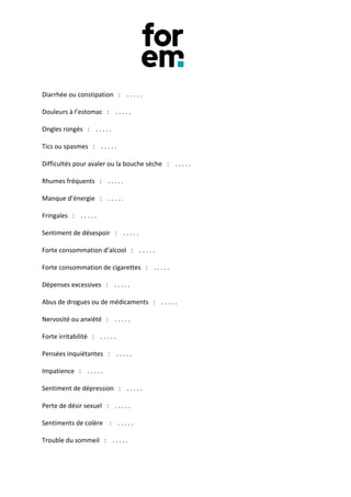 Le document présente une échelle d'évaluation du stress basée sur divers symptômes physiques et émotionnels, chacun étant noté de 0 à 3. Les scores obtenus classifient le niveau de stress en quatre catégories : bas, moyen, modérément élevé, et élevé à critique. Cette évaluation vise à aider les individus à prendre conscience de leur niveau de stress et à envisager des solutions appropriées.