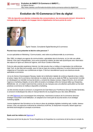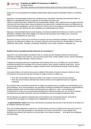Le document traite de l'évolution de l'e-commerce à l'ère numérique, soulignant la nécessité pour les commerçants de réinventer leurs magasins à travers la digitalisation et l'intégration de nouvelles technologies. Il décrit également les différentes stratégies et pratiques que les entreprises doivent adopter pour répondre à la demande des consommateurs, ainsi que l'importance d'une approche multicanale pour améliorer l'expérience client. Enfin, le document met en avant l'influence des réseaux sociaux et des programmes de fidélisation sur les comportements d'achat des consommateurs.