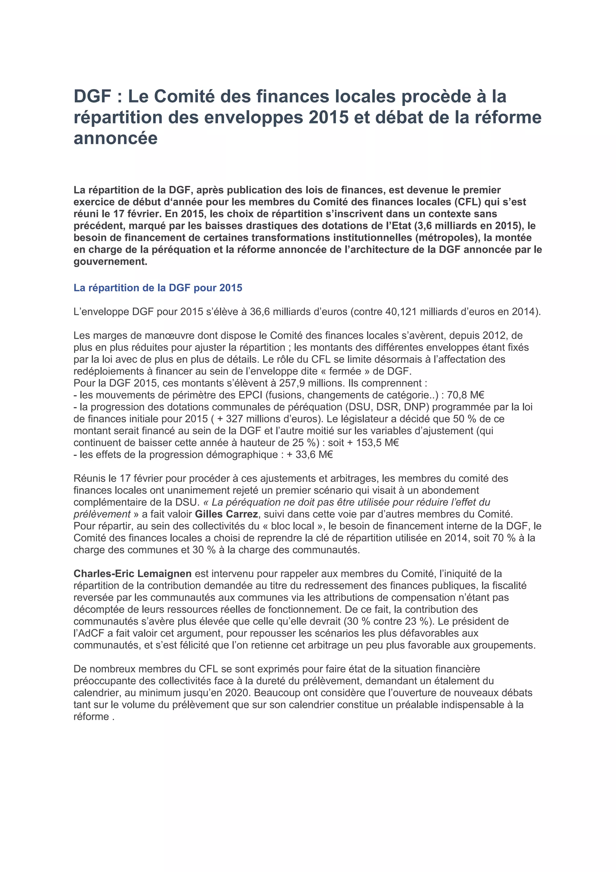 Le comité des finances locales a discuté de la répartition de la dotation globale de financement (DGF) pour 2015 dans un contexte marqué par des baisses de financement de l'État et des réformes institutionnelles. Les membres ont choisi de reprendre la clé de répartition de 2014, tout en soulignant la nécessité d'une réforme élargie de la DGF pour l'intégrer dans une logique de péréquation plus équitable. Un calendrier serré a été établi pour la mise en œuvre de cette réforme en 2016, visant à simplifier et ajuster les critères de répartition des dotations.
