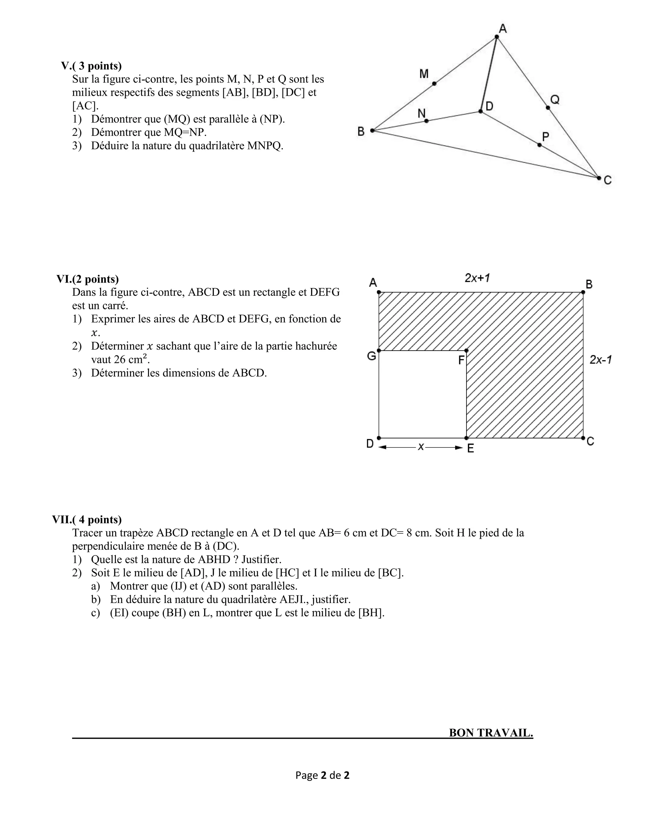Le document est un examen de mathématiques pour la classe de EB8, comprenant divers exercices sur les polynômes, les fractions, la géométrie et les propriétés des figures. Les questions incluent des démonstrations, des calculs et des justifications sur des concepts mathématiques spécifiques. L'examen vise à évaluer la compréhension des élèves sur plusieurs thèmes mathématiques fondamentaux.