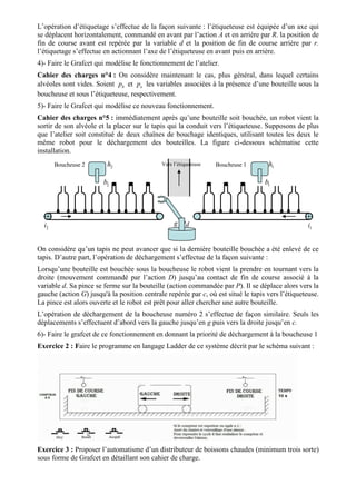 Le document présente un examen de systèmes automatisés de production dans le cadre d'un master en microélectronique, se concentrant sur un atelier de bouchage de bouteilles. Il décrit plusieurs cahiers des charges associés à la modélisation du fonctionnement de l'atelier, y compris les commandes, les graphiques de fonctionnement (grafcets) et les exigences d'un automate pour le déchargement des bouteilles. L'examen demande également de développer un programme en langage ladder et un grafcet pour un distributeur de boissons chaudes.