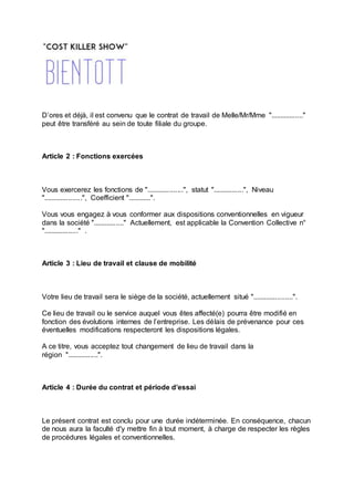 Le document est un contrat de travail entre la société 'bientott' et un salarié, définissant les termes de l'engagement, les fonctions, la durée indéterminée du contrat, les obligations en matière de confidentialité, de fidélité et de propriété intellectuelle. Les articles abordent également la rémunération, les conditions de travail, les déplacements professionnels, ainsi que les clauses de non-concurrence. Enfin, il décrit les modalités de résiliation et les droits relatifs à l'image du salarié.