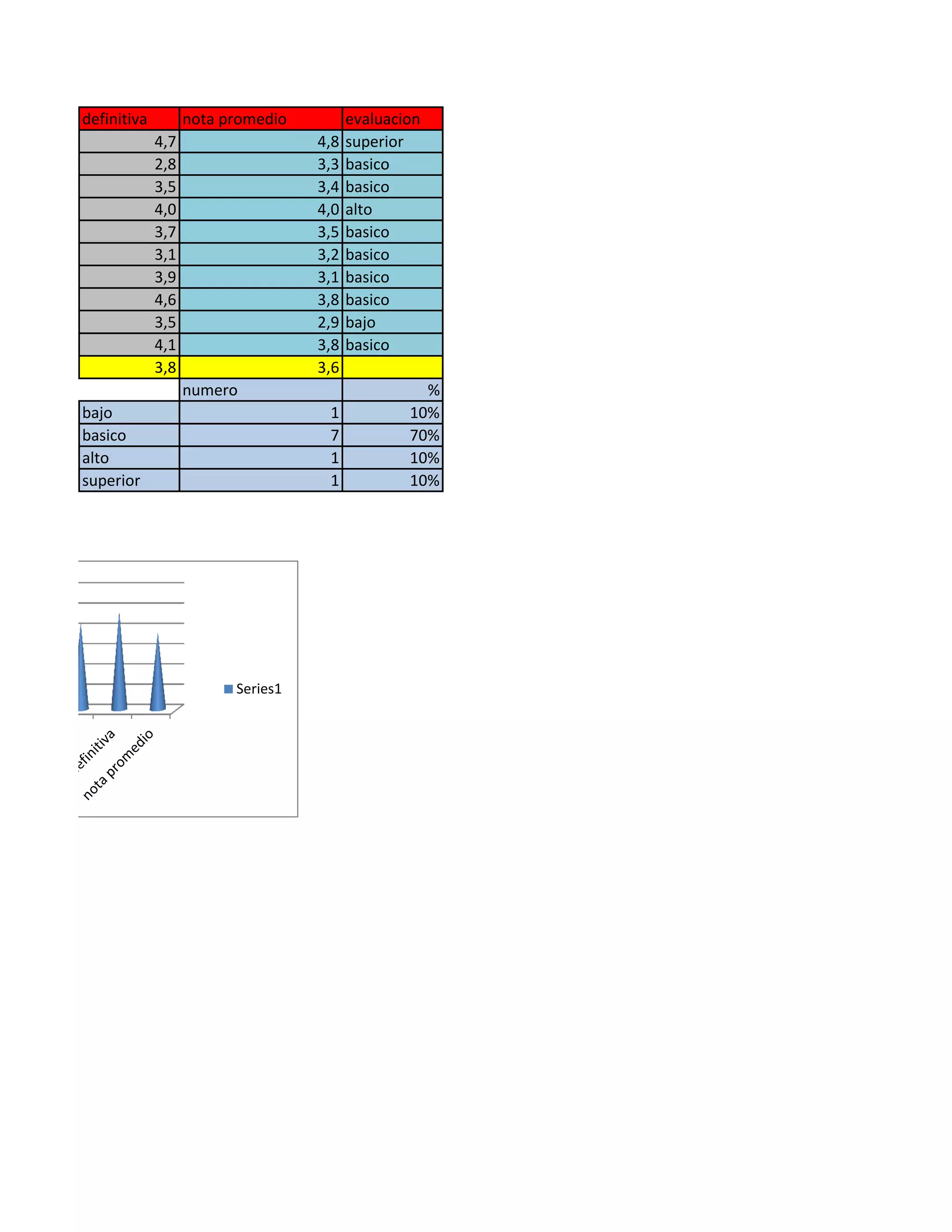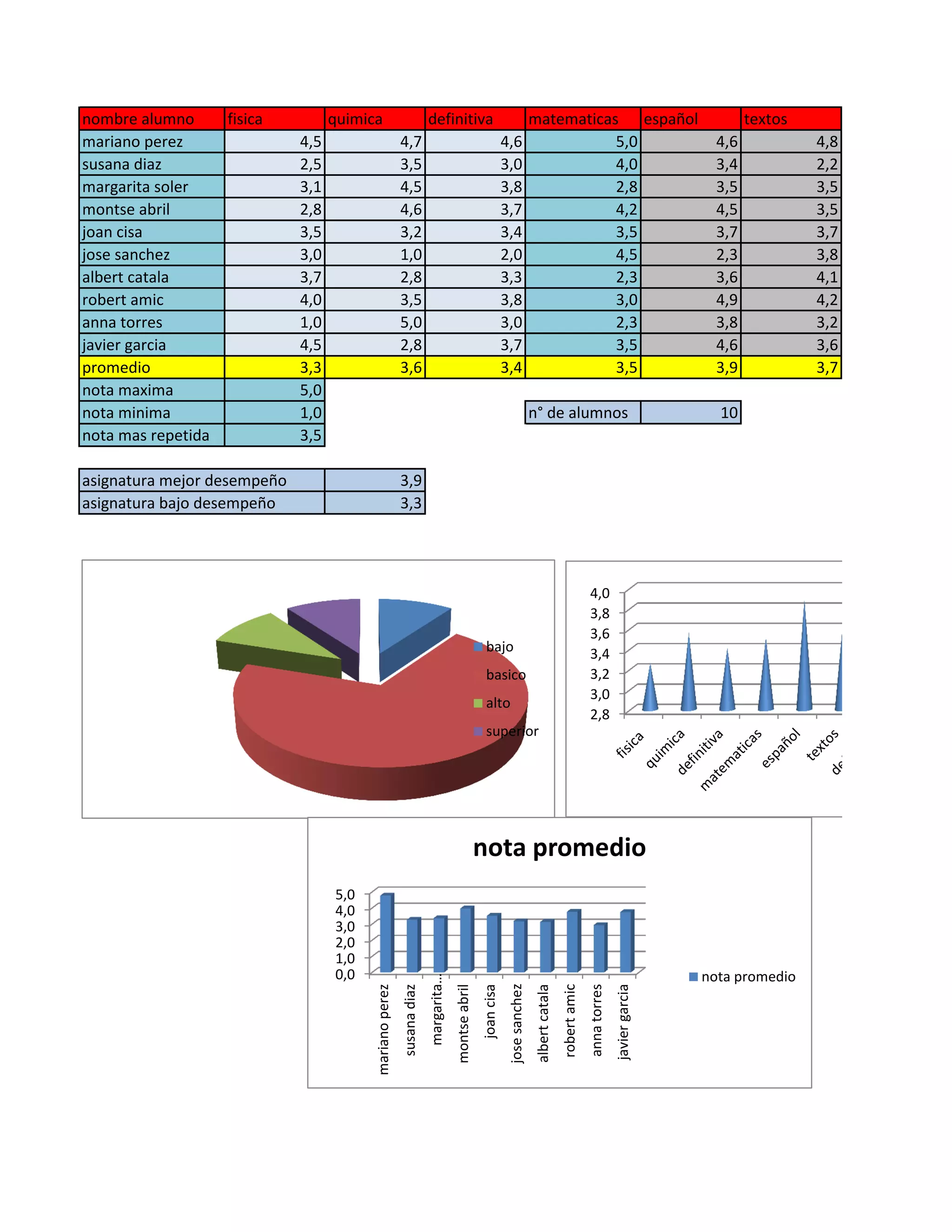 Le document présente les résultats académiques de dix élèves dans différentes matières, avec des notes allant de 1,0 à 5,0. La moyenne générale est de 3,7, et la matière avec le meilleur score est l'espagnol, tandis que la chimie montre un faible rendement. La majorité des élèves se situent dans la catégorie basique selon les performances.