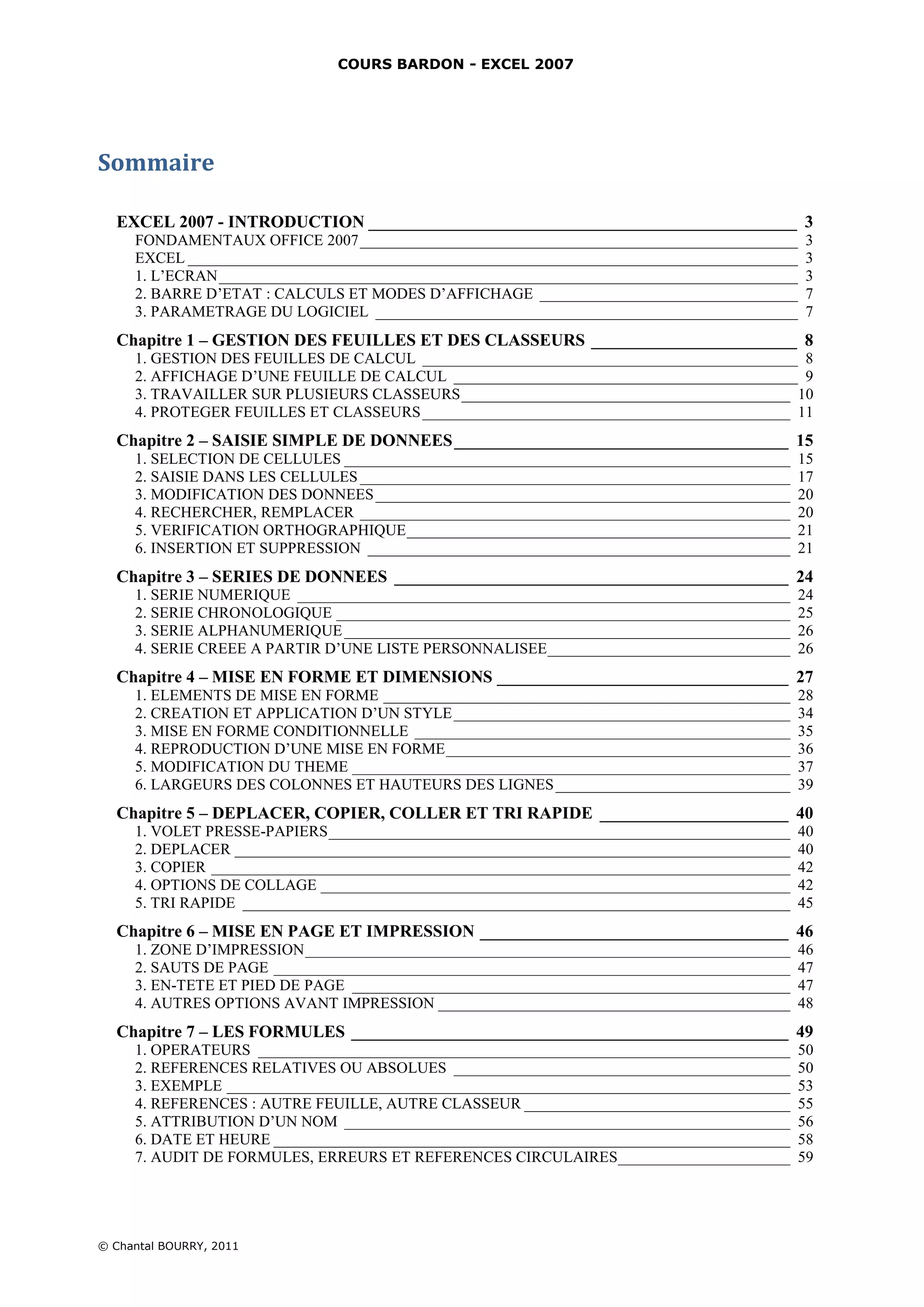 Le document est un guide détaillé sur l'utilisation d'Excel 2007, couvrant les fondamentaux, la gestion des feuilles et des classeurs, ainsi que les fonctions et formules. Il présente également des instructions sur la mise en forme, l'impression, la création de graphiques et tableaux croisés dynamiques. Chaque section est riche en informations pratiques pour maîtriser le logiciel et ses fonctionnalités.