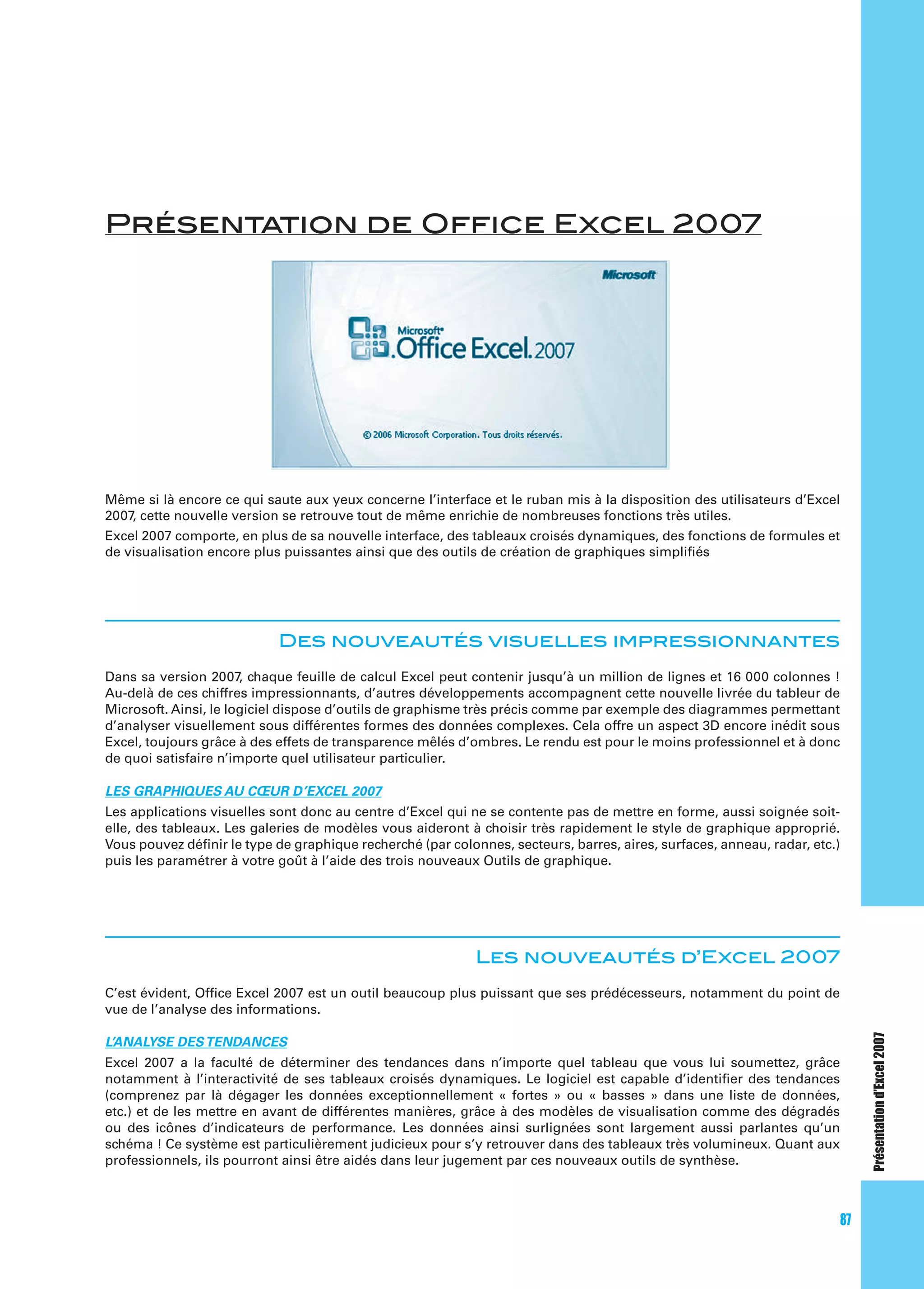Excel 2007 améliore considérablement l'interface utilisateur et offre des fonctionnalités avancées telles que des tableaux croisés dynamiques et des outils de visualisation puissants. Les utilisateurs peuvent créer des graphiques 3D impressionnants, analyser des tendances dans des ensembles de données volumineux, et profiter de l'automatisation des formules pour éviter les erreurs. Cette version d'Excel facilite également la collaboration et la mise en page personnalisée des feuilles de calcul.