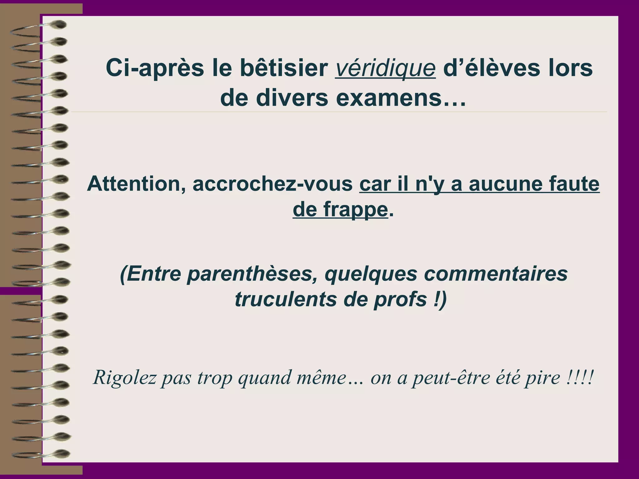 Le document présente une compilation humoristique de réponses d'élèves lors d'examens, mettant en lumière des erreurs comiques et des commentaires amusants des professeurs. Les affirmations varient entre des anecdotes historiques déformées et des idées absurdes sur différents sujets. L'ensemble vise à divertir tout en se moquant des erreurs d'apprentissage des élèves.