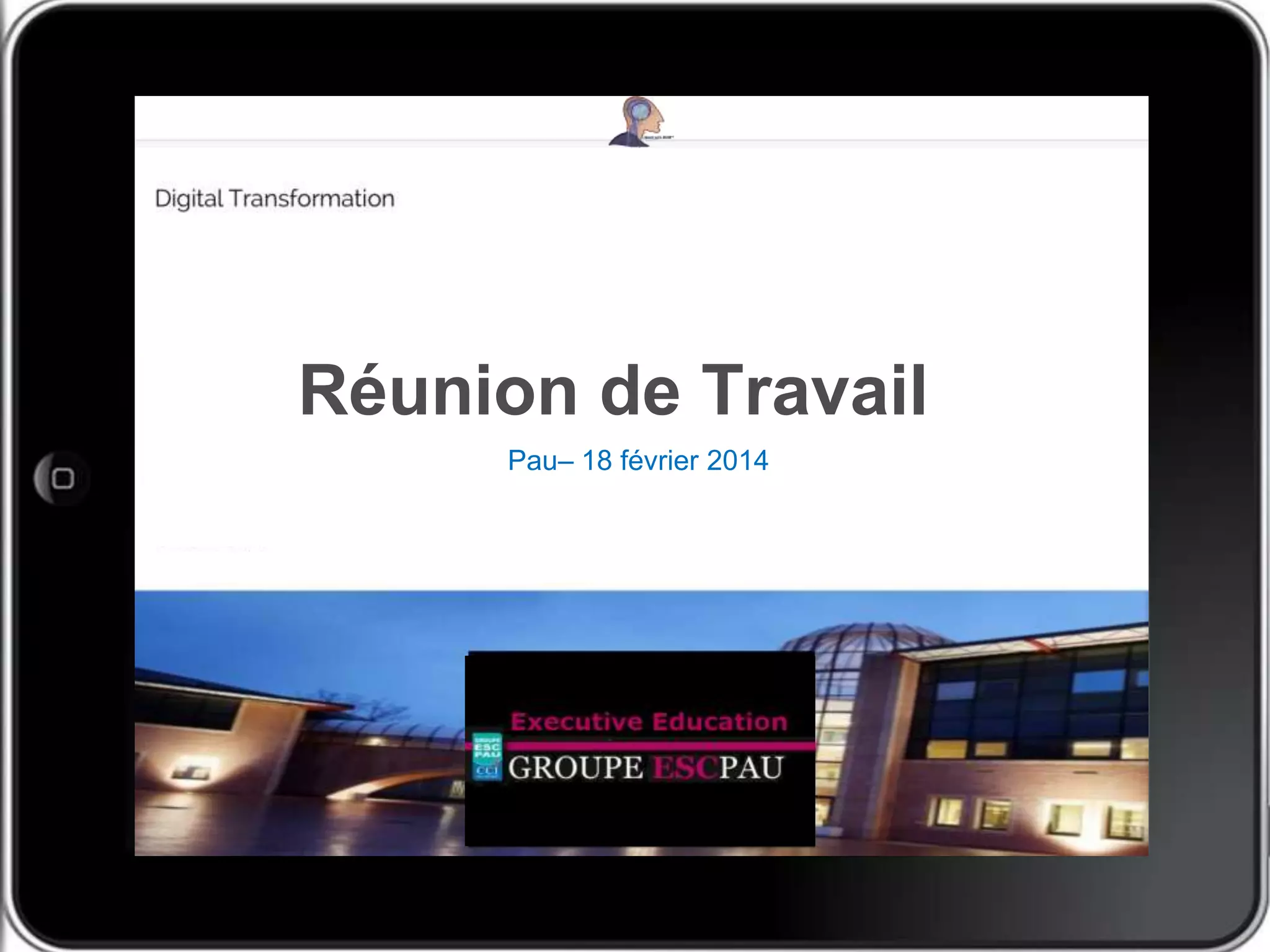 La réunion du groupe ESC Pau du 18 février 2014 se concentre sur le développement d'une offre d'éducation exécutive axée sur la transformation digitale et la valorisation de l'homme. Les cibles incluent des entreprises comme Euralis et Safran, et la stratégie visée est une approche communautaire et contextualisée. Les objectifs comprennent la construction d'une offre ciblée et l'intégration de partenaires institutionnels.