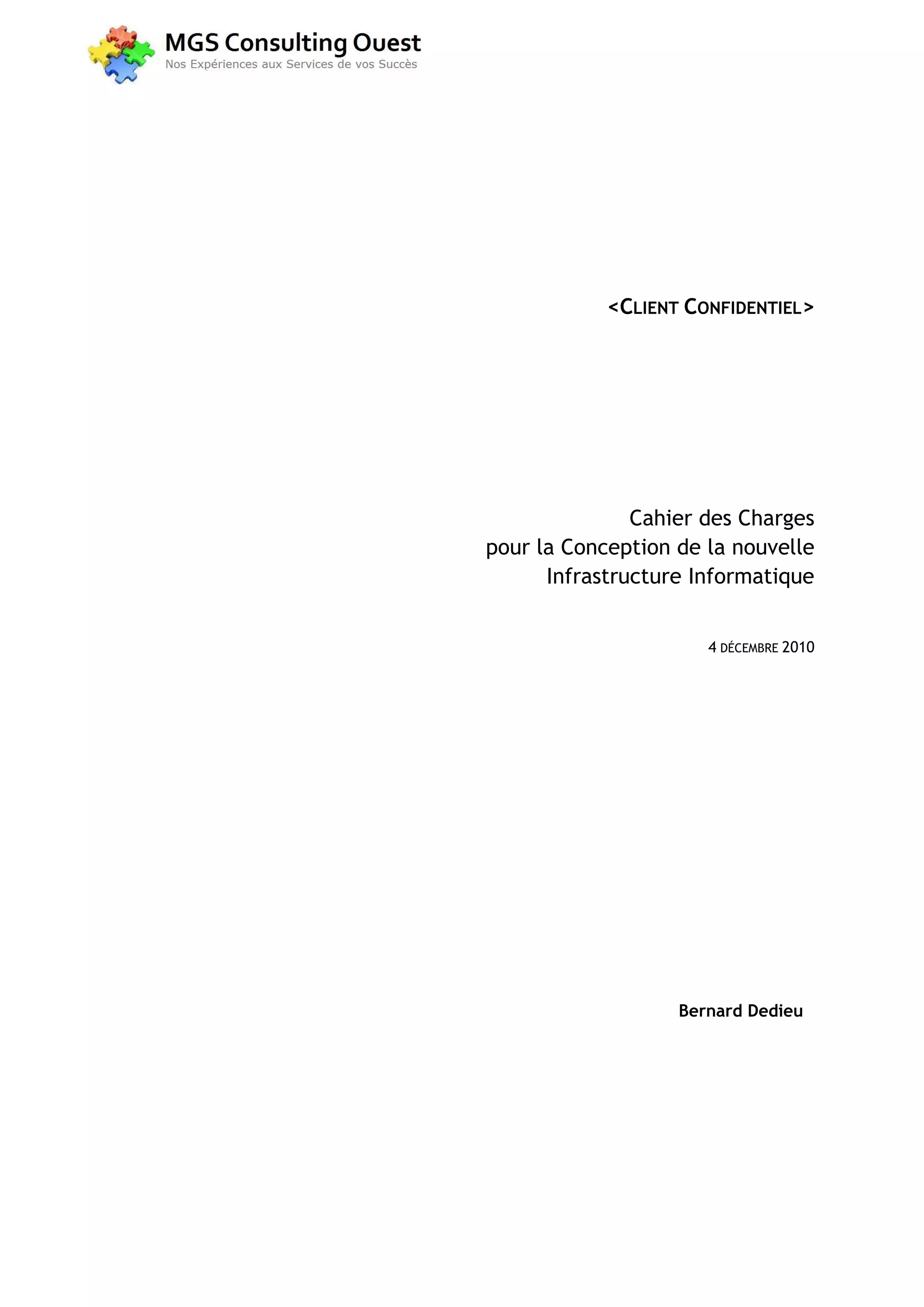 Le document est un cahier des charges pour la conception d'une nouvelle infrastructure informatique pour un client, spécifiant les objectifs, les acteurs du projet, ainsi que l'environnement informatique actuel. Il détaille également les attentes en matière de conception, d'installation et de maintenance du matériel, ainsi que les normes et standards à respecter. Le projet vise à créer une infrastructure évolutive intégrant un réseau local adapté aux besoins futurs du client.