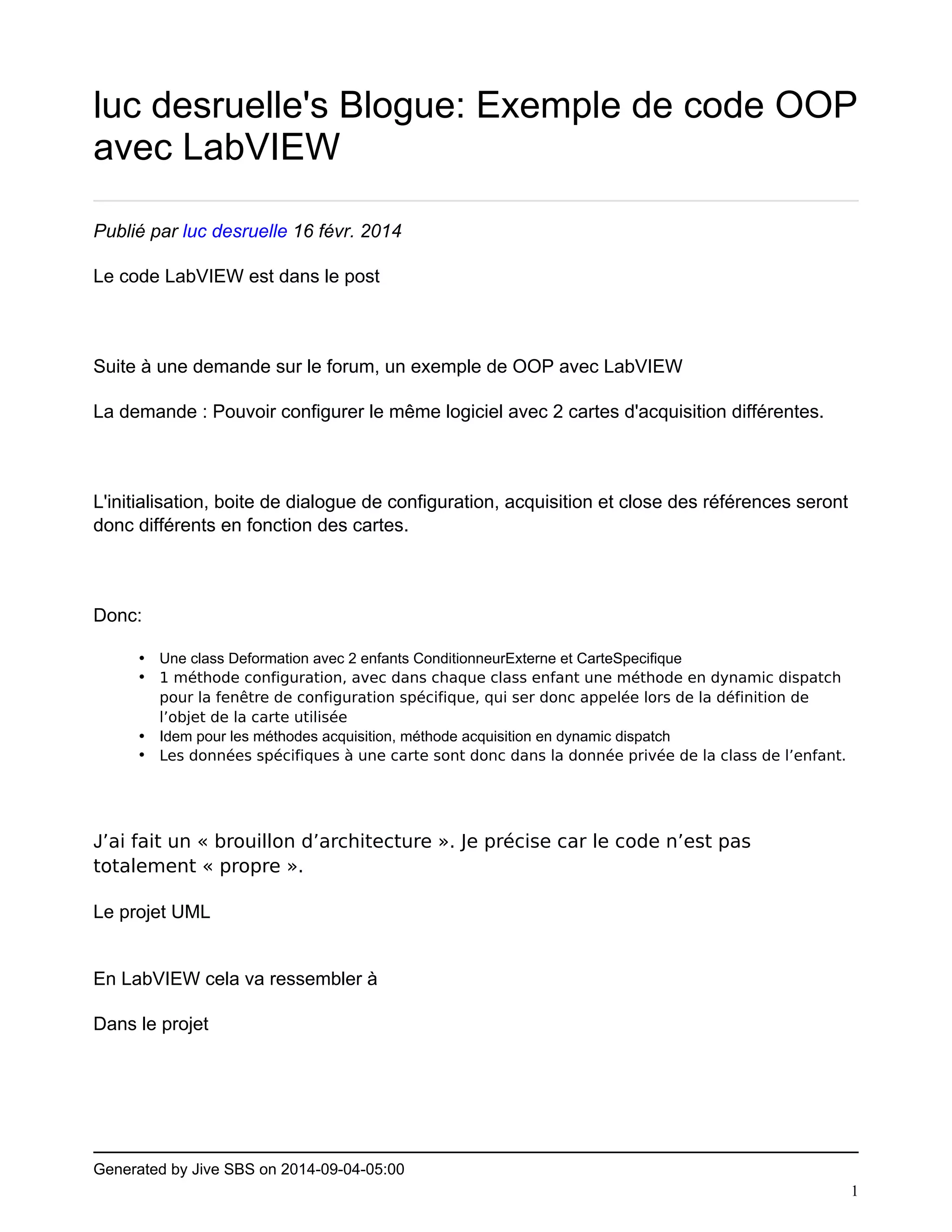 Le document présente un exemple de programmation orientée objet (OOP) avec LabVIEW, notamment l'utilisation de classes pour gérer deux cartes d'acquisition différentes. Il aborde également la question de la réutilisation des classes OOP entre plusieurs projets, suggérant l'importance de maintenir un seul code source et d'utiliser des dépôts SCC pour la gestion du code. Enfin, l'auteur participe à des échanges avec la communauté pour améliorer l'architecture des projets utilisant cette approche.