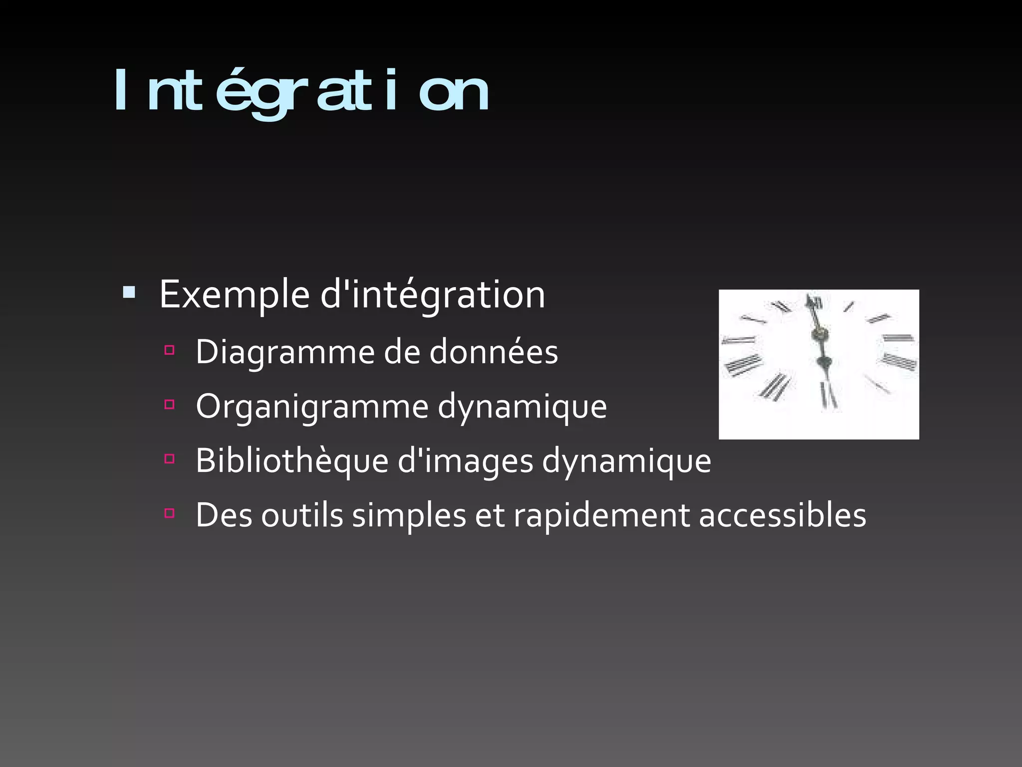 Le document présente des exemples d'intégration et des outils pour la gestion de projets, comme des organigrammes dynamiques et des diagrammes de Gantt. Il souligne l'importance de la visualisation des résultats et de l'accessibilité rapide aux fonctionnalités. Des processus automatisés avec validation des saisies sont également mentionnés pour améliorer l'efficacité.
