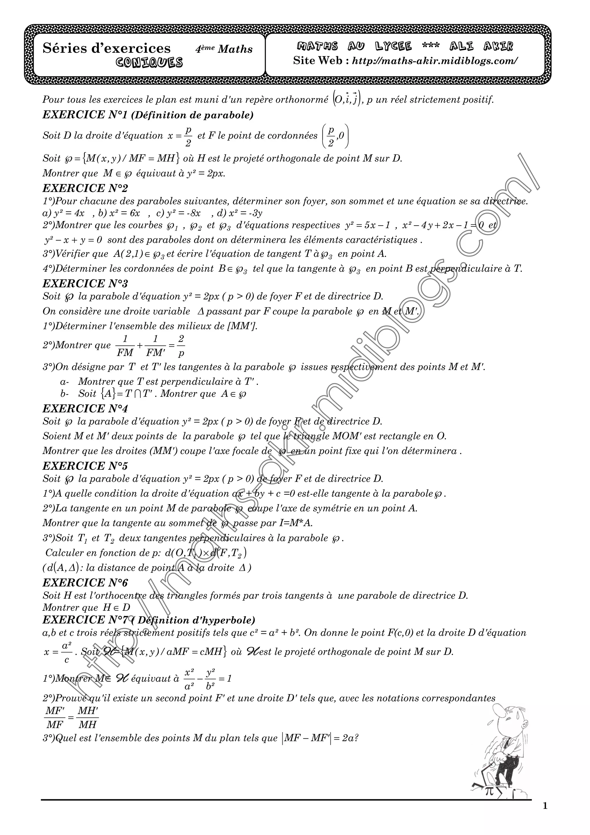 Le document présente une série d'exercices sur les coniques (paraboles, hyperboles, ellipses) en mathématiques, détaillant notamment leurs propriétés, leurs foyers, sommets et directrices. Chaque exercice demande aux élèves de démontrer des équations ou des propriétés géométriques spécifiques relatives aux courbes définies. Les exercices sont accompagnés de définitions, d'illustrations et de précisions sur les conditions nécessaires pour établir des tangentes ou des intersections.