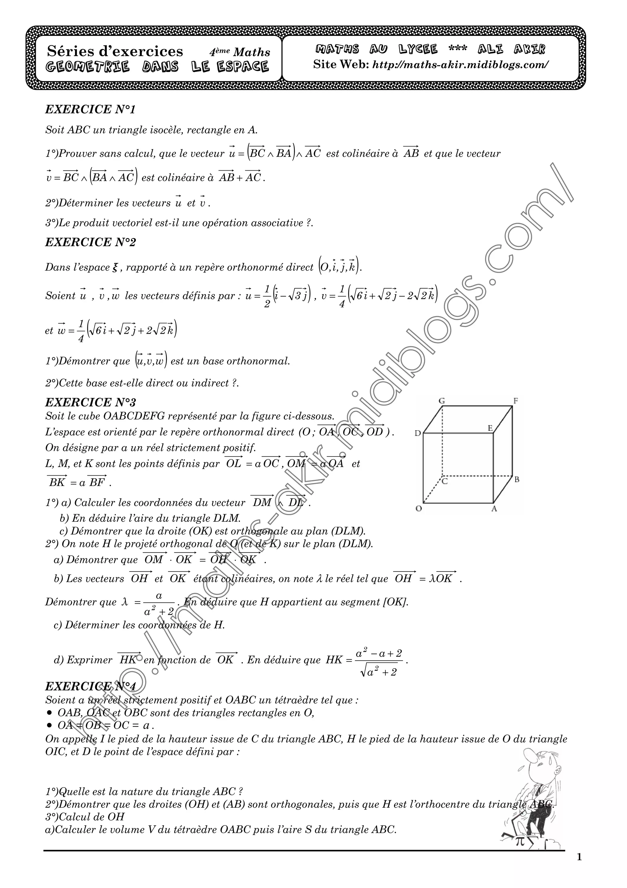 Le document contient un ensemble d'exercices de géométrie dans l'espace, abordant des concepts tels que les vecteurs, les triangles, les tétraèdres et les sphères. Chaque exercice pose des problèmes variés, allant de la vérification de colinéarité de vecteurs à la détermination de coordonnées et de volumes dans un cadre orthonormé. Il met l'accent sur la démonstration de propriétés géométriques à l'aide de méthodes analytiques.