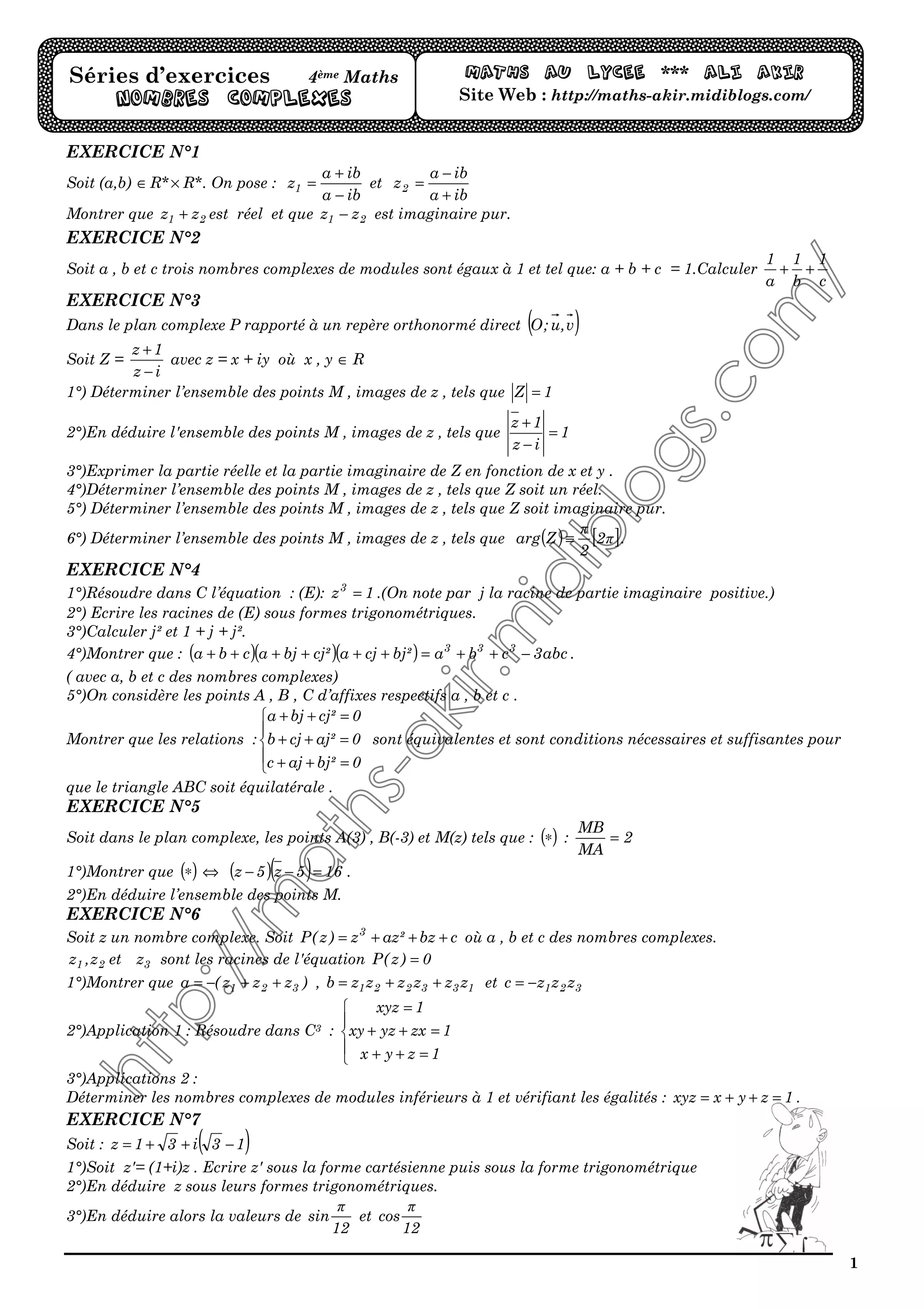 Le document présente une série d'exercices mathématiques sur les nombres complexes, abordant des concepts tels que les modules, les arguments, et les équations complexes. Chaque exercice requiert des démonstrations ou des calculs pour déterminer des propriétés spécifiques des nombres complexes et leur représentation géométrique. Les thèmes incluent la trigonométrie, les racines de polynômes complexes, et les relations géométriques dans le plan complexe.