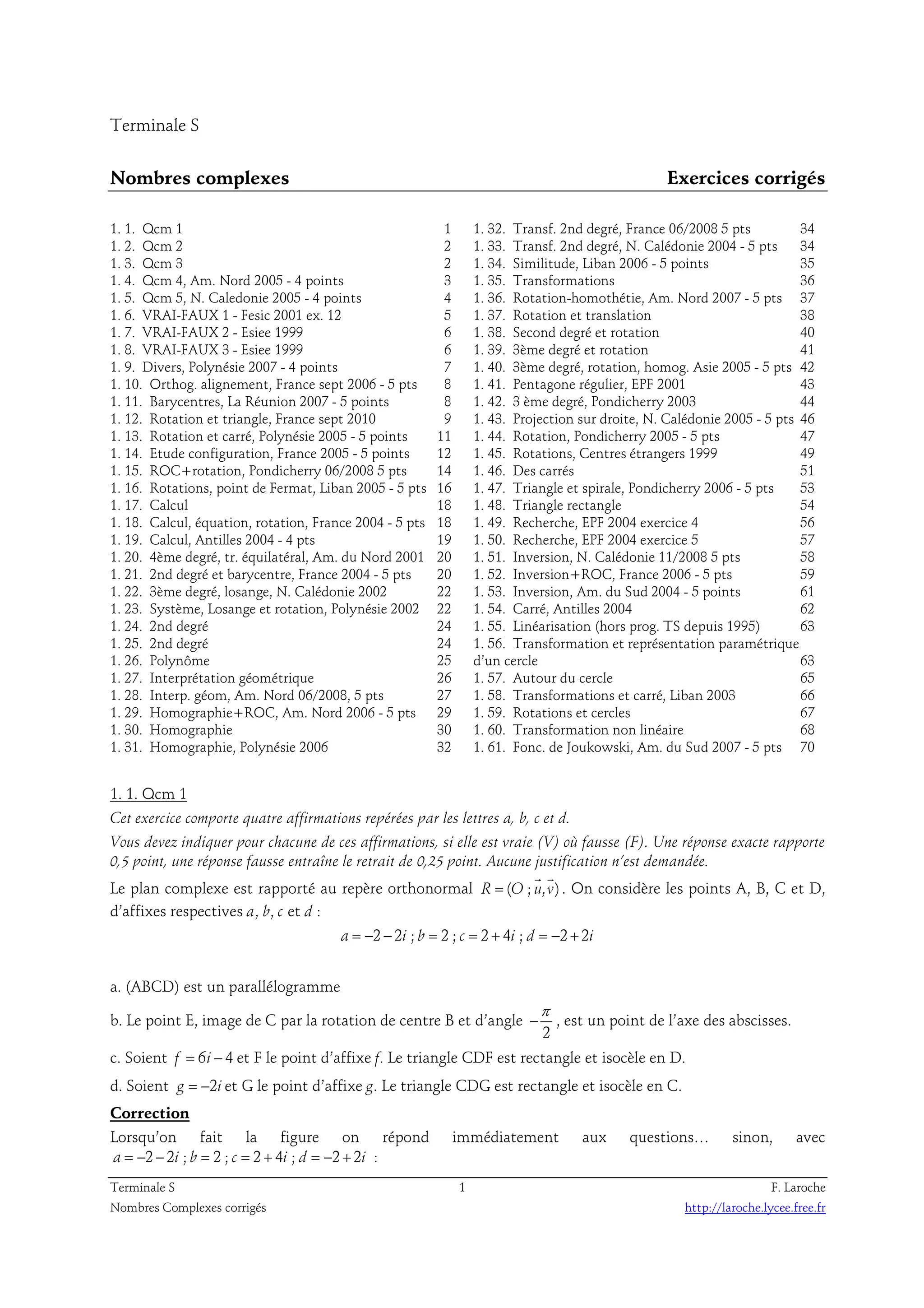 Le document présente une série d'exercices corrigés sur les nombres complexes, comprenant des QCM, des questions de vrai-faux et des exercices de calcul. Chaque exercice aborde différentes propriétés des nombres complexes avec des corrections détaillées. Il s'adresse aux étudiants de terminale S et inclut des questions provenant de plusieurs académies, comme des énoncés et des solutions de problèmes géométriques et algébriques.