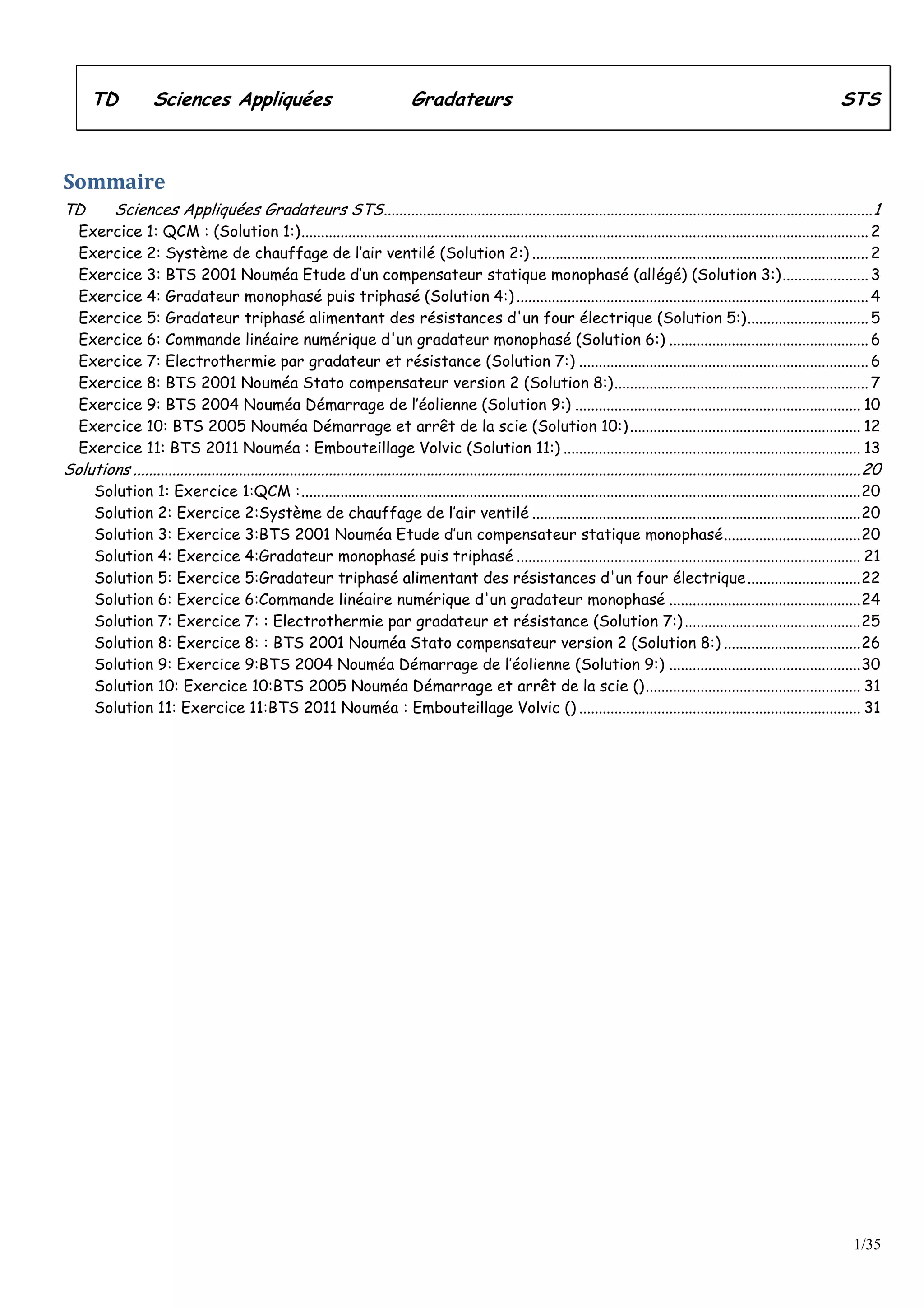 Le document contient des exercices variés liés aux gradateurs monophasés et triphasés, systèmes de chauffage, et compensateurs statiques, avec des études de cas et des solutions associées. Il aborde des concepts de commande par angle de retard et rapport cyclique, ainsi que des calculs de puissance active et réactive. Chaque exercice est suivi d'une solution détaillée pour approfondir la compréhension des systèmes étudiés.