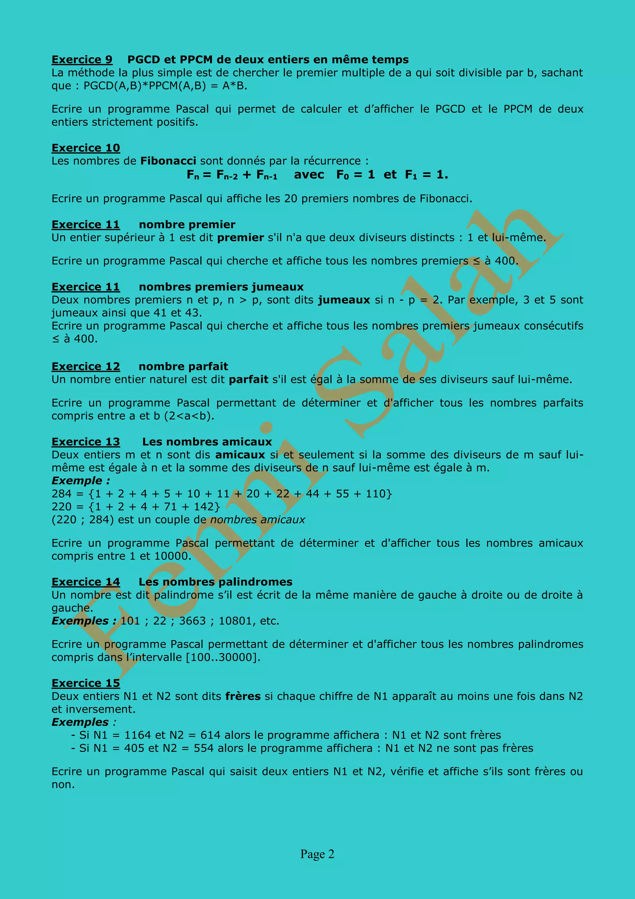 Le document présente une série d'exercices de programmation en Pascal axés sur les nombres et leurs propriétés. Chaque exercice demande de développer un programme pour résoudre des problèmes mathématiques variés, tels que la vérification de la parité, la génération de permutations de chiffres, ou la détermination de nombres particuliers comme les palindromes, les nombres premiers, et les nombres parfaits. L'ensemble des exercices vise à renforcer la compétence en programmation tout en appliquant des concepts mathématiques.