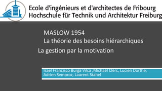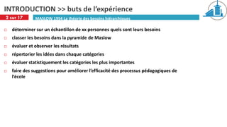 Le document présente une étude basée sur la théorie des besoins hiérarchiques de Maslow, visant à évaluer les besoins des participants et à les classer selon la pyramide de Maslow. Il aborde également les facteurs motivants et démotivants, ainsi que des suggestions pour améliorer l'efficacité pédagogique. Enfin, il souligne l'importance des aspects sécuritaires, de la communication et du rapport à la vie professionnelle.