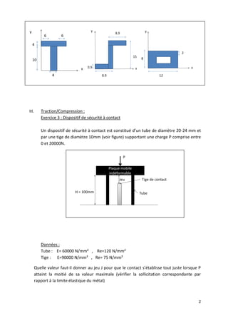 Le document présente plusieurs exercices sur la statique et la résistance des matériaux, incluant le calcul des torseurs de cohésion, la détermination des efforts dans des structures de support, ainsi que l'analyse des caractéristiques géométriques des sections planes. Il aborde également des concepts comme la traction/compression dans des dispositifs de sécurité et l'analyse des treillis. Les exercices visent à appliquer des principes d'équilibre et de résistance pour déterminer les charges et les moments dans des configurations spécifiques.