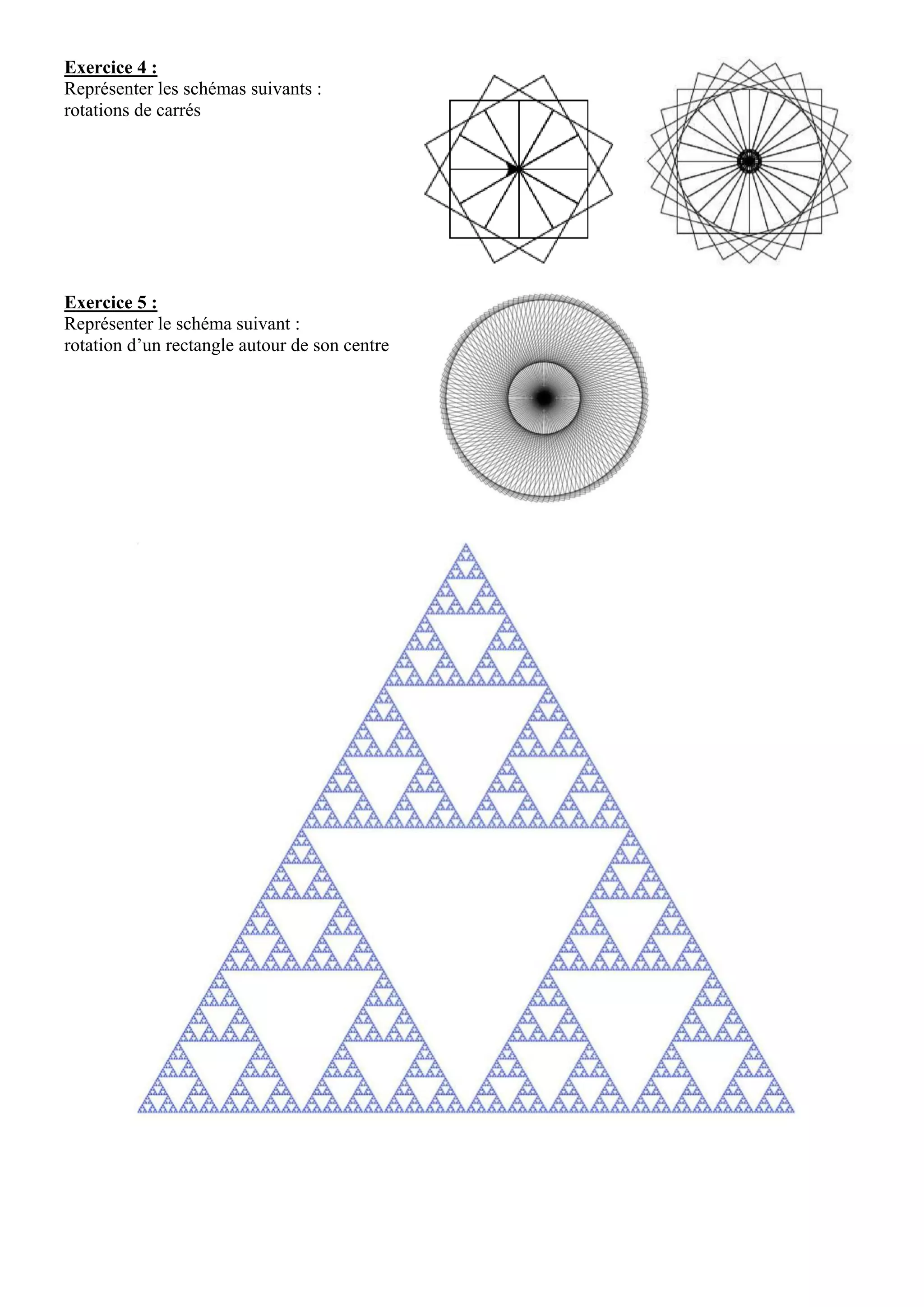 Le document présente des exercices sur l'utilisation de Python Turtle, expliquant diverses commandes de base telles que 'up()', 'down()', 'forward()', 'left()', et 'right()'. Il inclut plusieurs exercices pratiques, notamment la représentation de cercles imbriqués, rotations de figures géométriques, et la réalisation d'arbres de Pythagore. Chaque exercice est accompagné de code Python pour illustrer les concepts abordés.