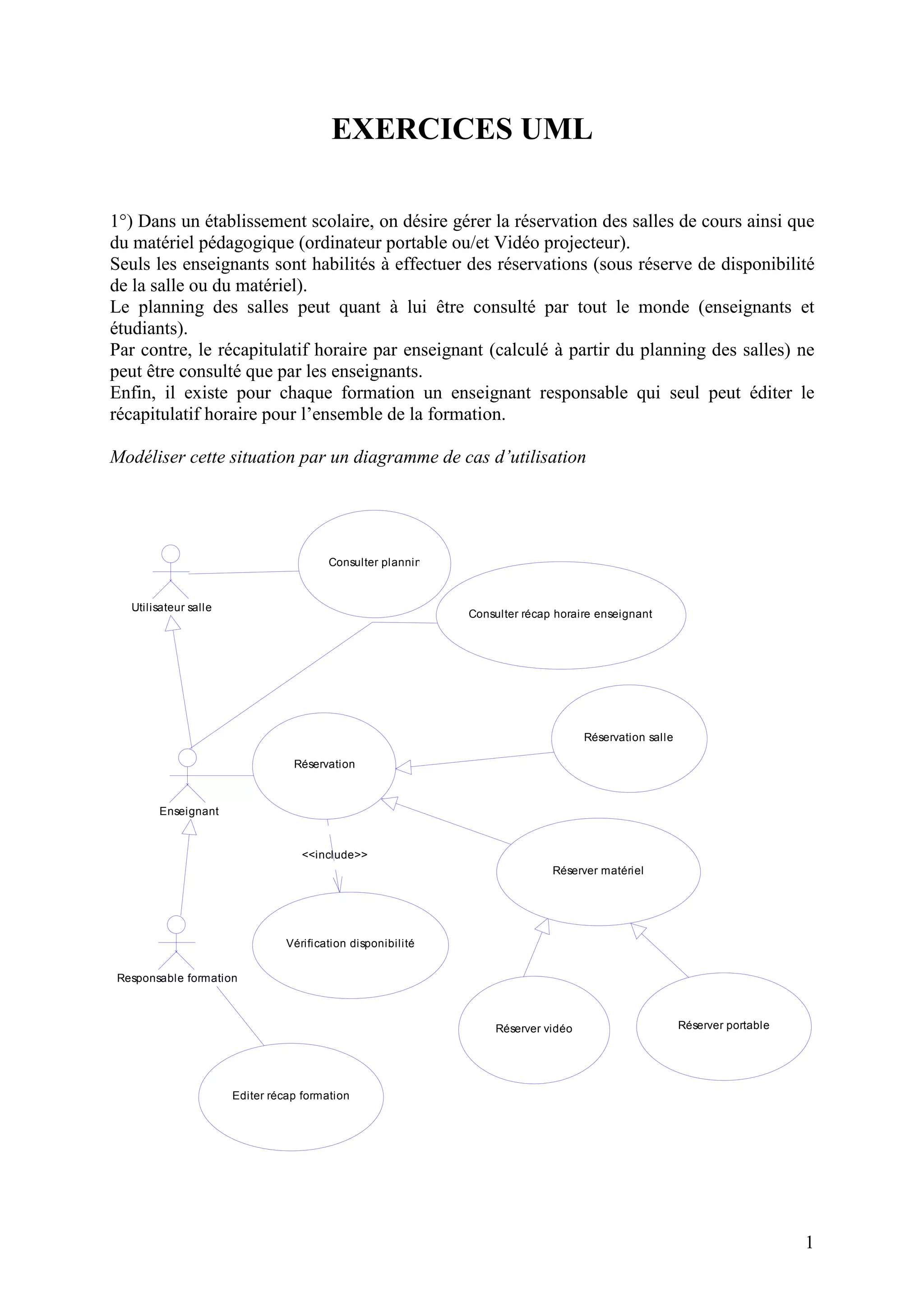 Le document présente une série d'exercices UML sur la modélisation de différents systèmes, y compris la gestion de réservations dans des établissements scolaires, la collecte de temps de travaux en viticulture, le fonctionnement d'un magasin, et l'utilisation de distributeurs automatiques de billets. Chaque exercice demande de réaliser des diagrammes de cas d'utilisation, de séquence ou de classes pour illustrer les interactions entre les acteurs et les systèmes. Les exemples incluent également des systèmes de gestion de stock, de vente, et de réservation de vols.