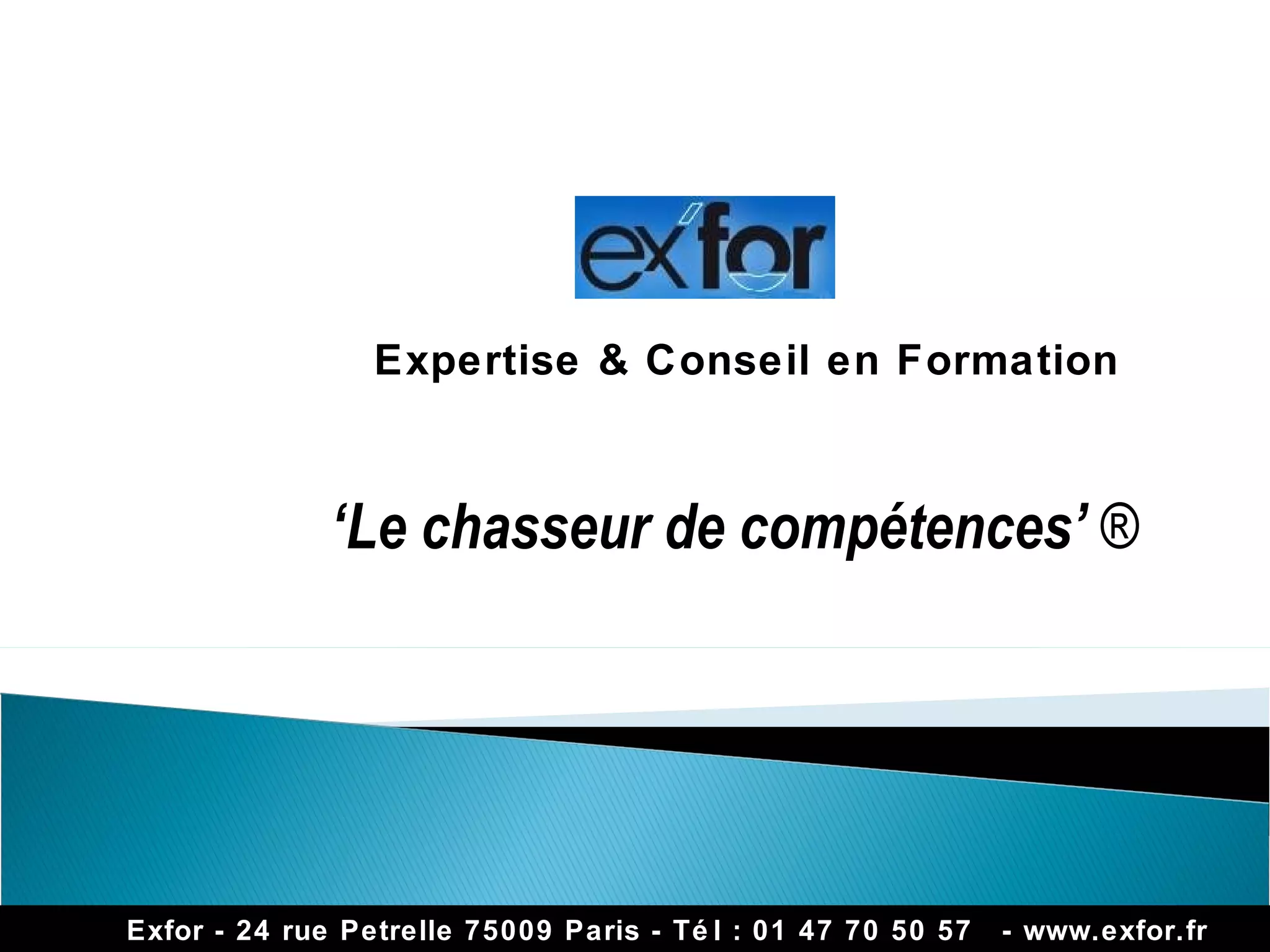 Exfor, situé à Paris, offre des services de recherche et de sélection de consultants et formateurs en formation, avec 25 ans d'expérience sur le marché. Leur démarche consiste à évaluer les besoins des clients, à proposer des prestataires adaptés et à les accompagner tout au long du projet, le tout sans frais pour le client. Exfor propose également des interventions pour des thématiques variées telles que le management, l'innovation et la gestion de projet.